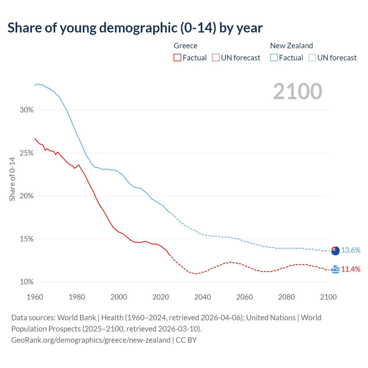 - The share of young demographic (0-15 years old) in Greece is 13.2% vs 18.1% in New Zealand.