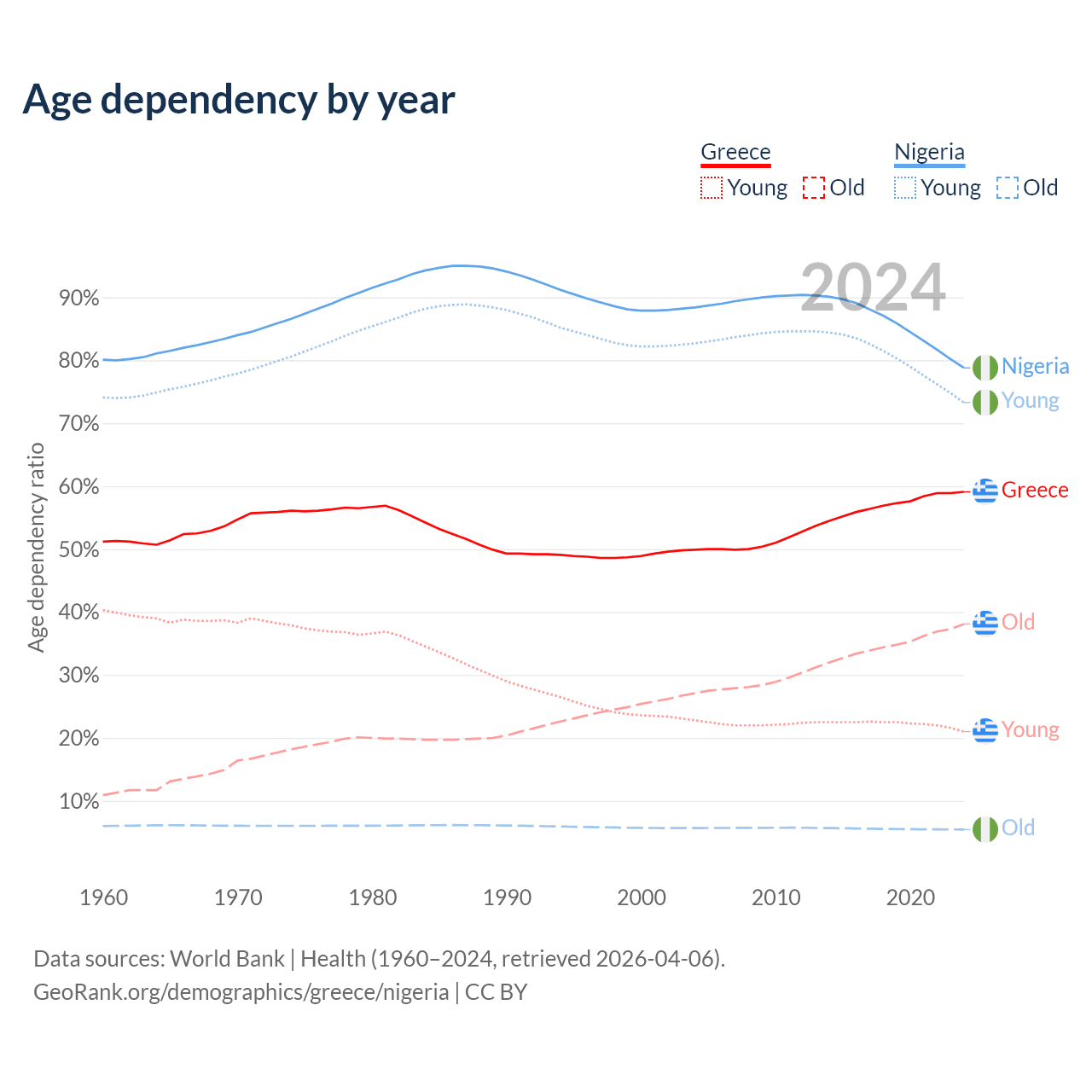 The share of older people aged 65 and over is 23.9% in Greece and 3.05% in Nigeria. Life expectancy in Greece compared to Nigeria .