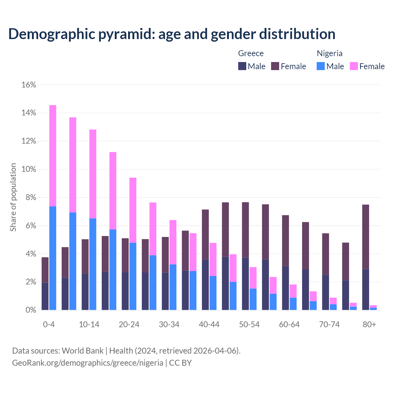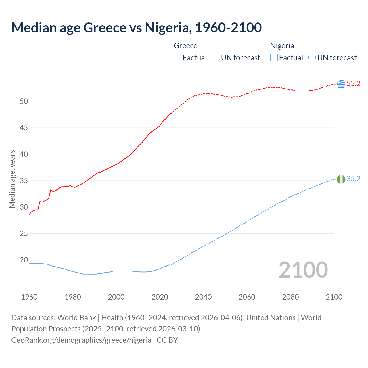 - Greece is ranked 6/196 by median age (oldest to youngest) vs 178/196 for Nigeria.