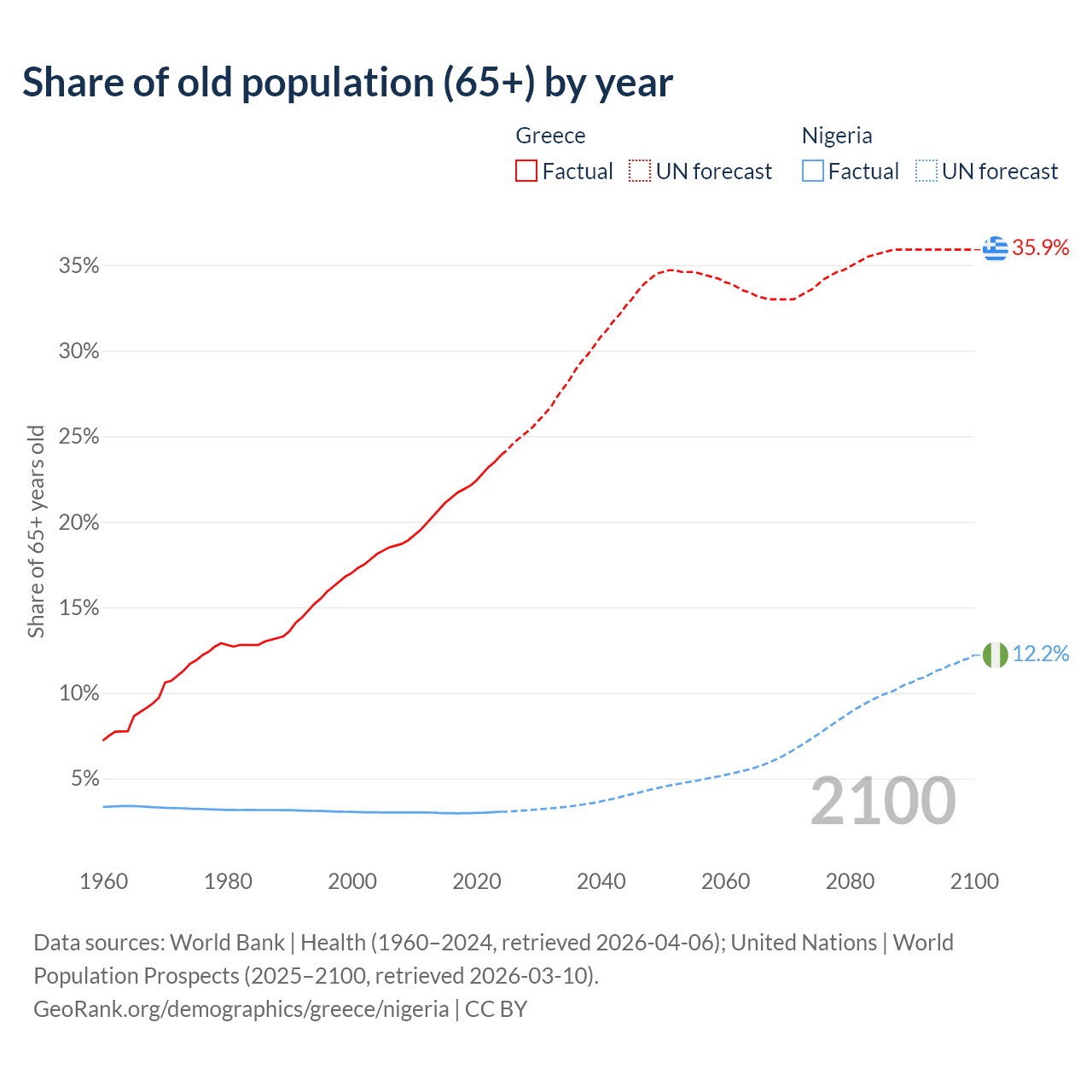 - The share of old-age demographic (65+) in Greece is 23.9% vs 3.05% in Nigeria.