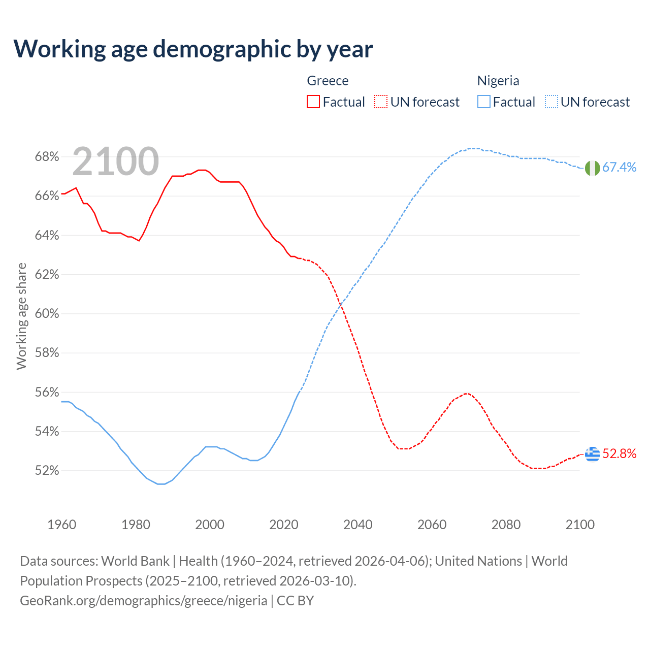 - Greece has 6.4M working age adults (aged 15-64) vs 136M in Nigeria.