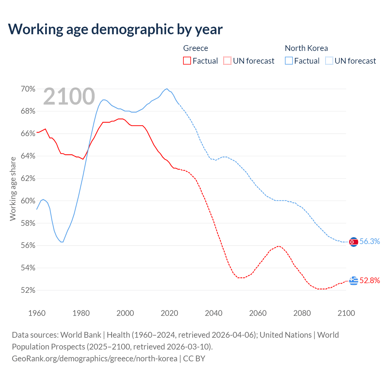 - Greece has 6.4M working age adults (aged 15-64) vs 18.3M in North Korea.