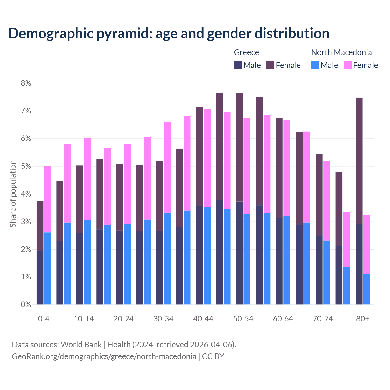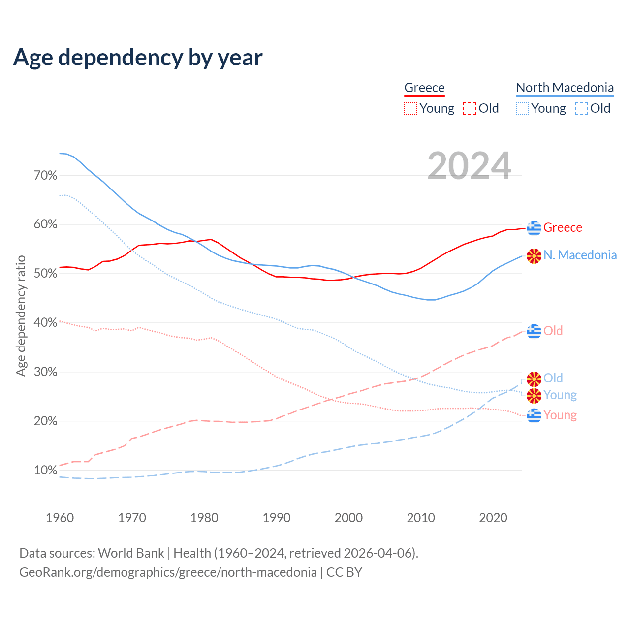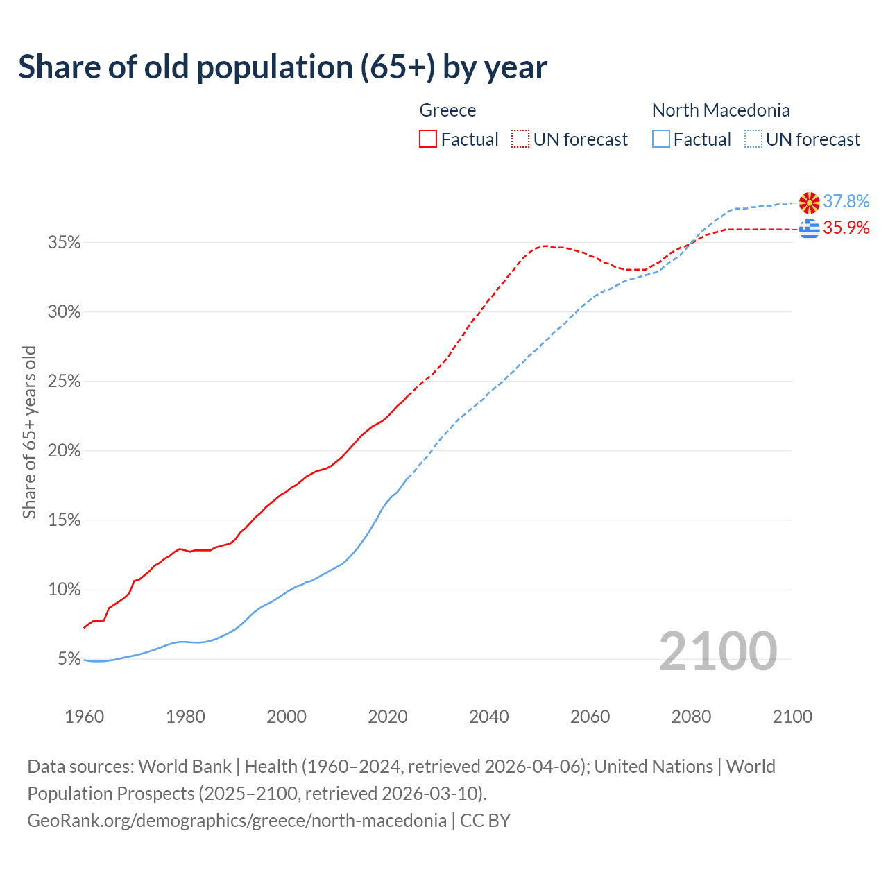 The share of older people aged 65 and over is 23.9% in Greece and 18% in North Macedonia. Life expectancy in Greece compared to North Macedonia .