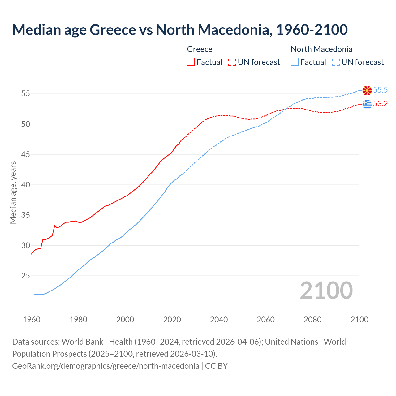 Median age Greece vs North Macedonia, 1960-2100