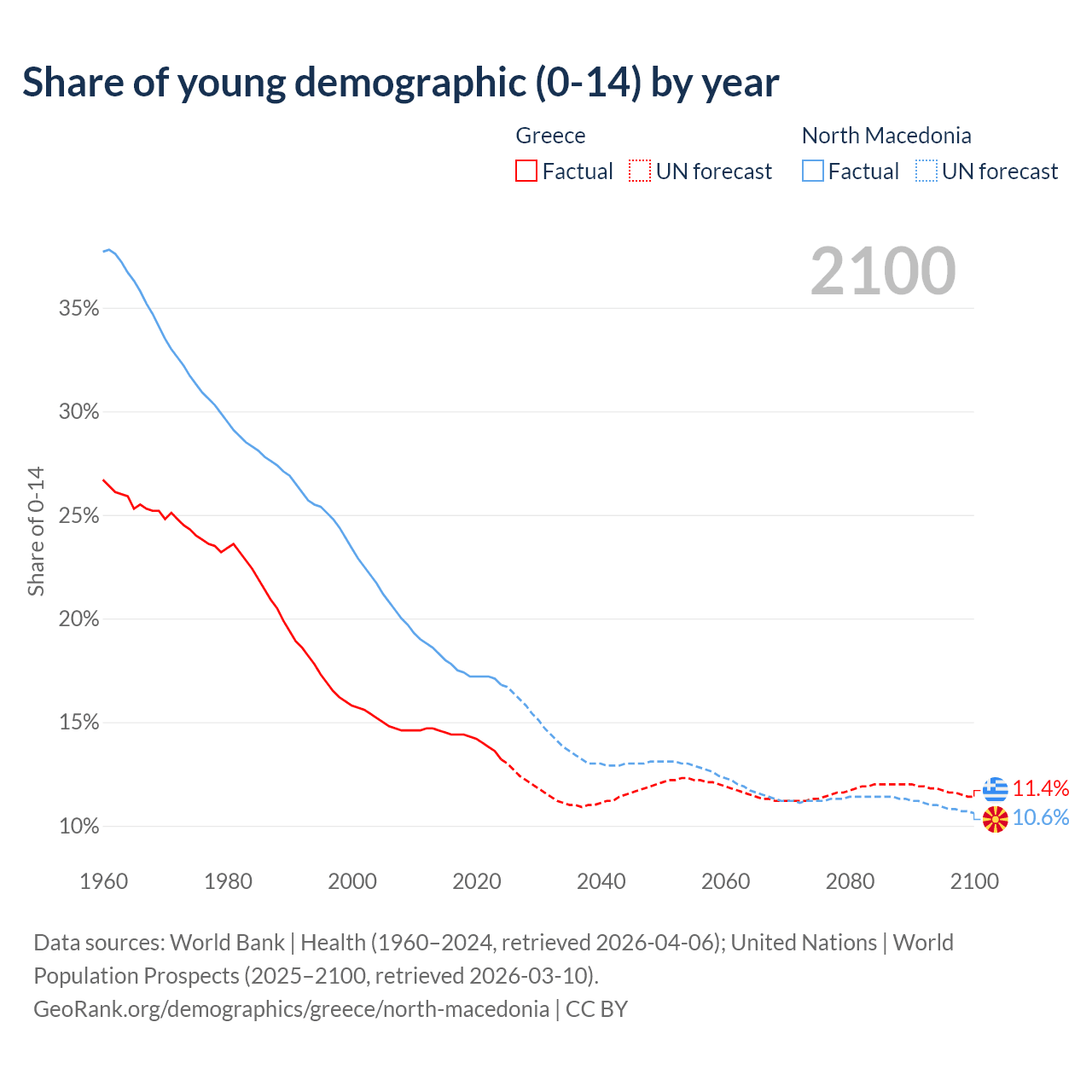 - The share of young demographic (0-15 years old) in Greece is 13.2% vs 16.8% in North Macedonia.