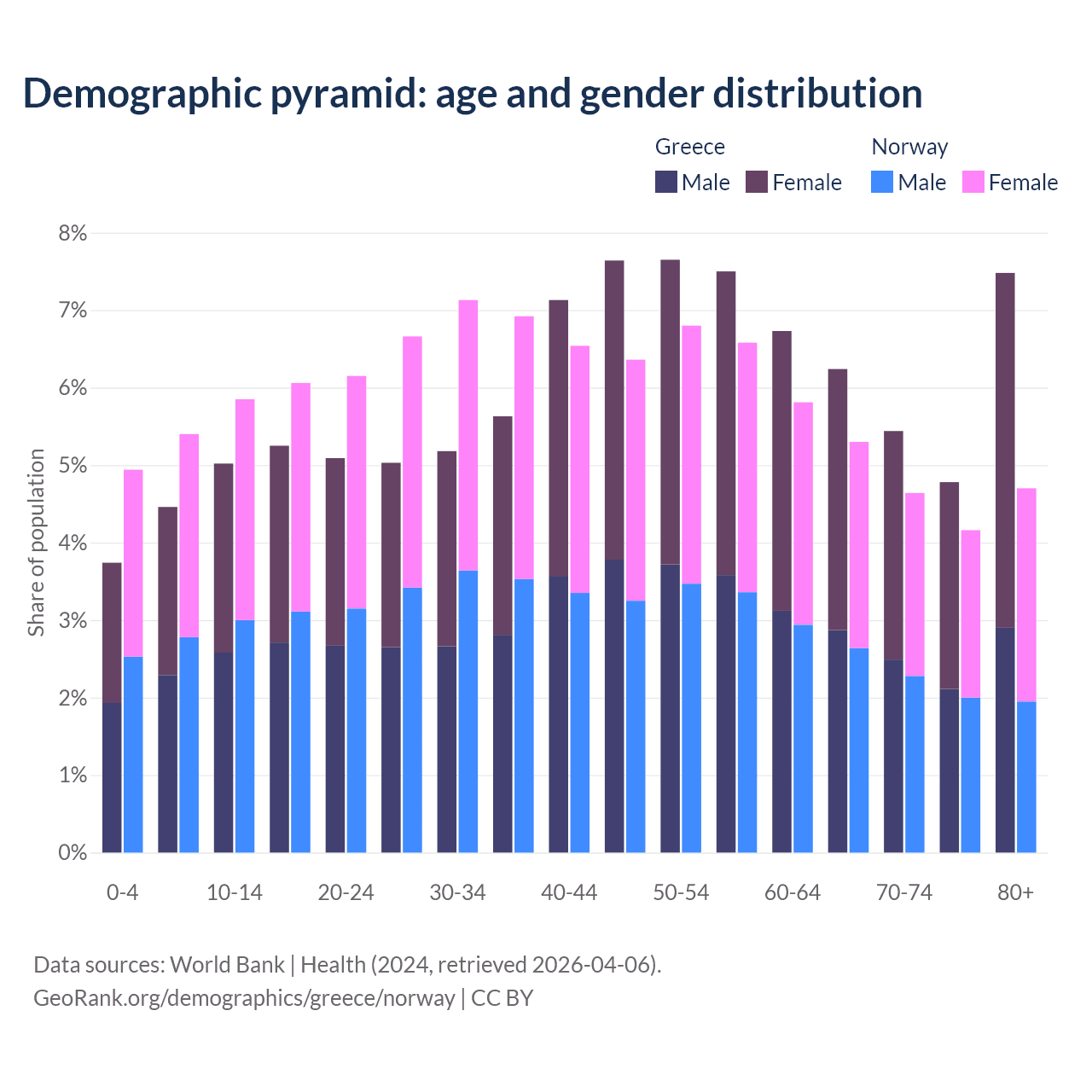 - Greece is ranked 6/196 by median age (oldest to youngest) vs 43/196 for Norway.