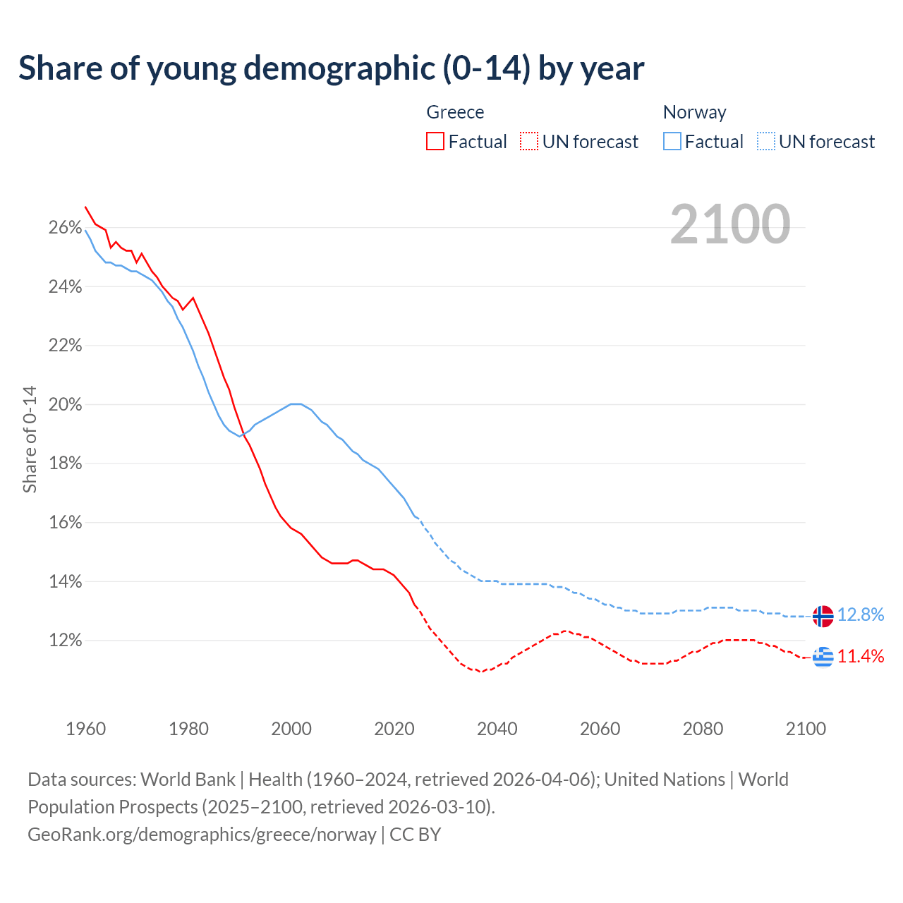 - The share of young demographic (0-15 years old) in Greece is 13.2% vs 16.2% in Norway.