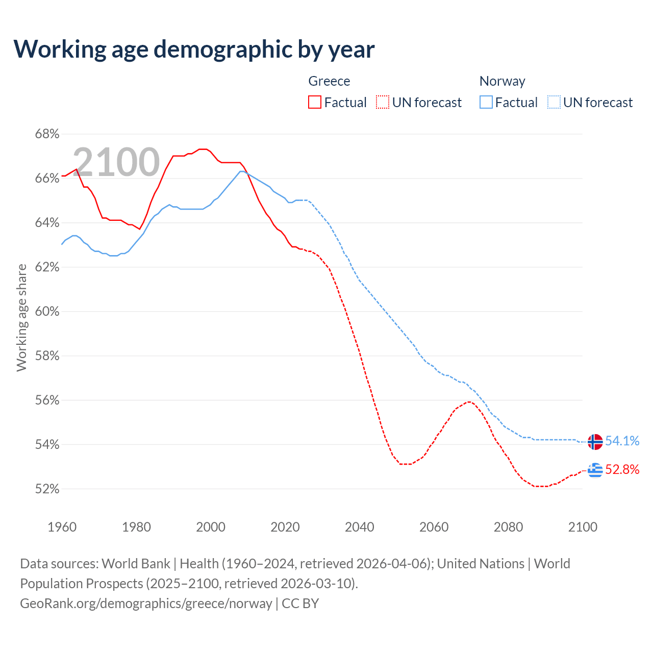 - Greece has 6.4M working age adults (aged 15-64) vs 3.69M in Norway.