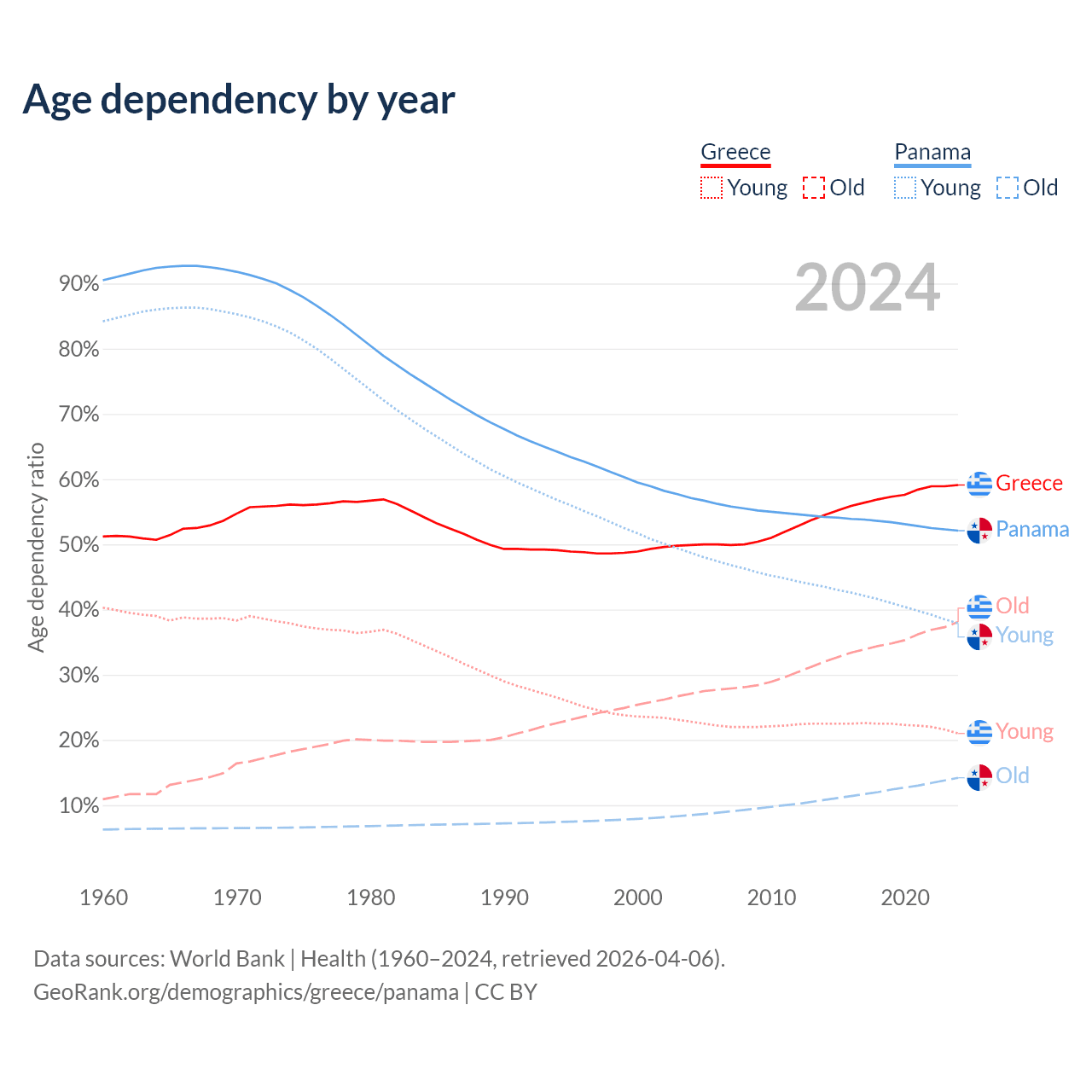 - Greece is ranked 6/196 by median age (oldest to youngest) vs 94/196 for Panama.