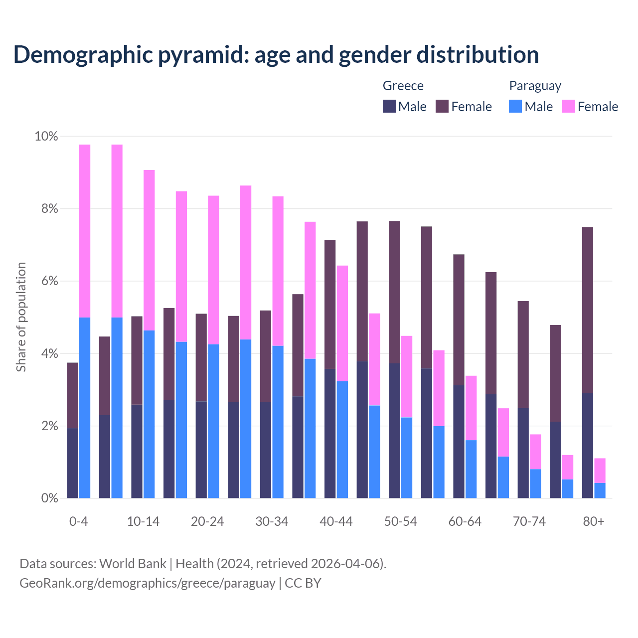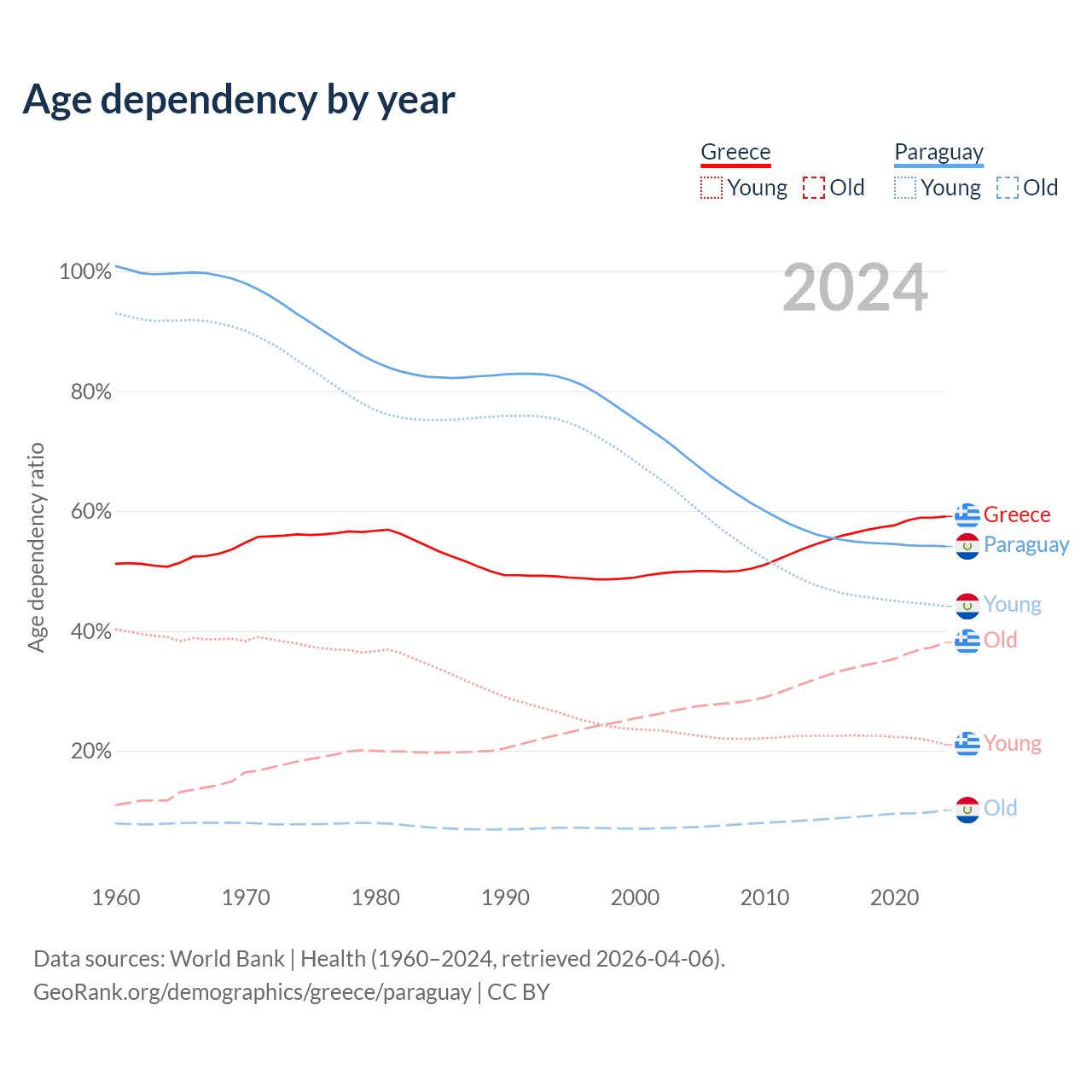 - The share of old-age demographic (65+) in Greece is 23.9% vs 6.54% in Paraguay.