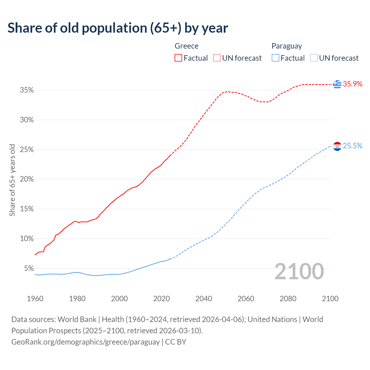 The share of older people aged 65 and over is 23.9% in Greece and 6.54% in Paraguay. Life expectancy in Greece compared to Paraguay .