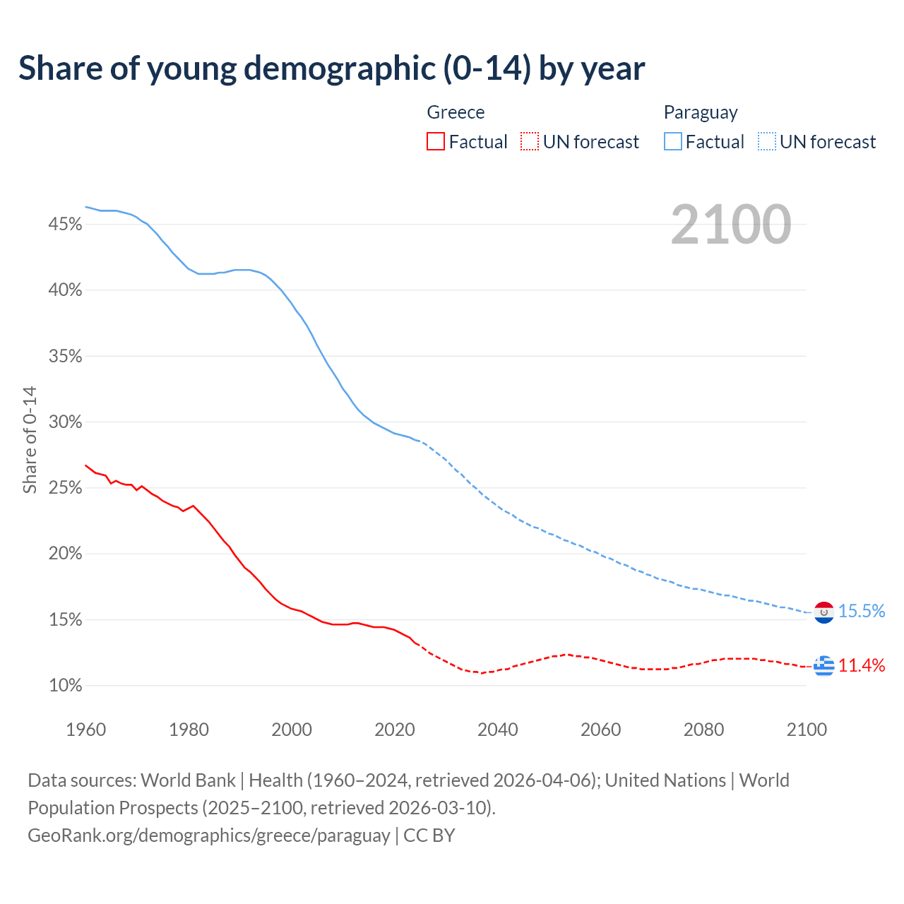 - The share of young demographic (0-15 years old) in Greece is 13.2% vs 28.6% in Paraguay.