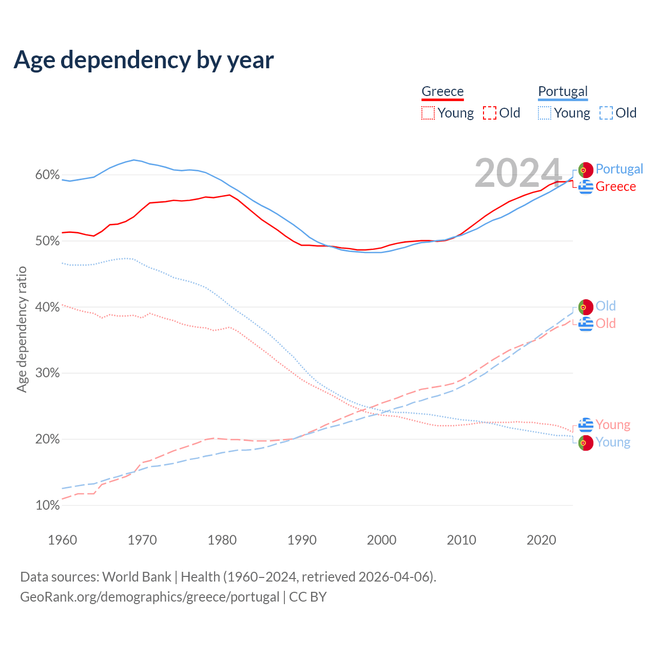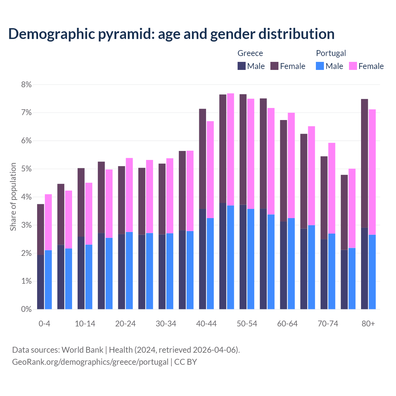 - Greece is ranked 6/196 by median age (oldest to youngest) vs 5/196 for Portugal.