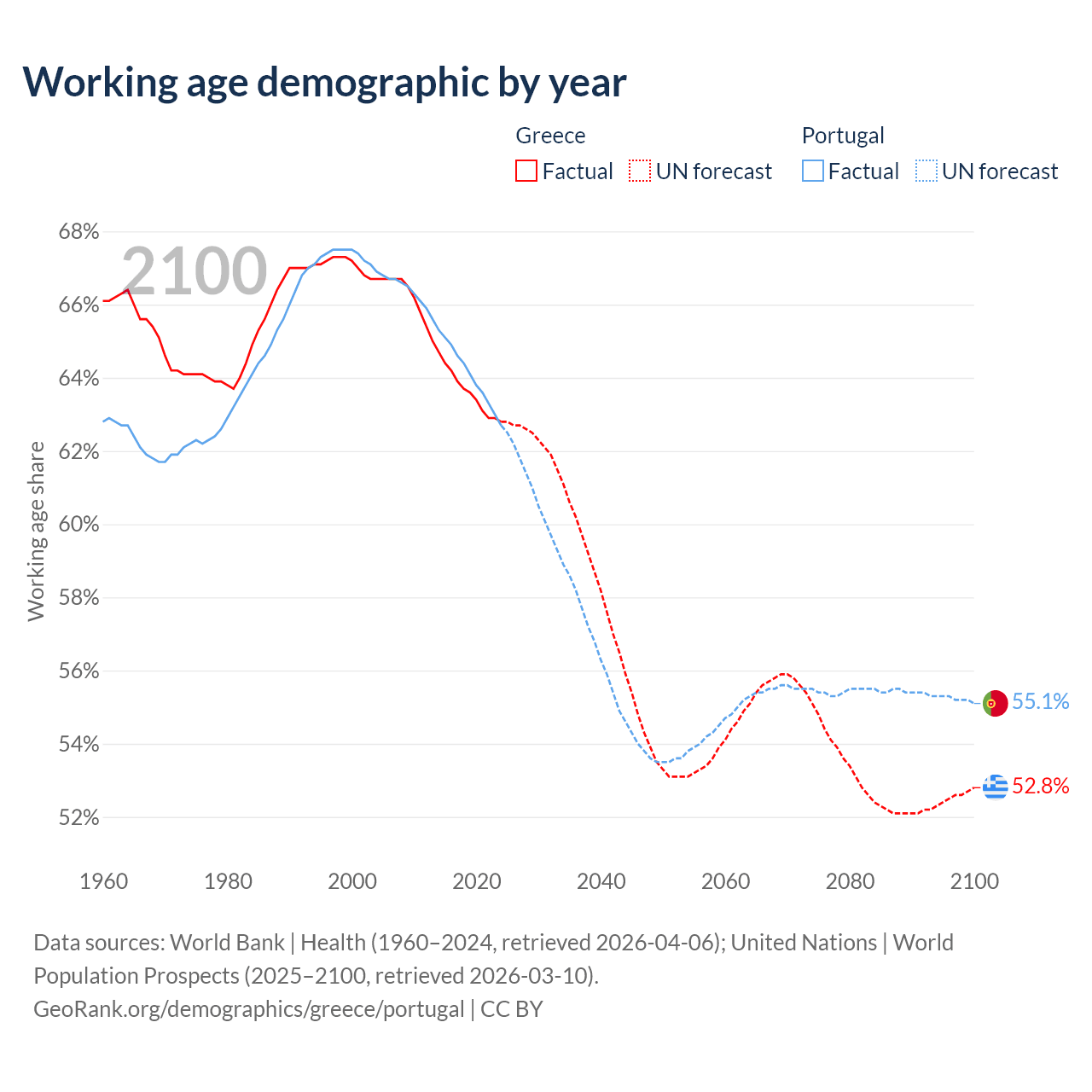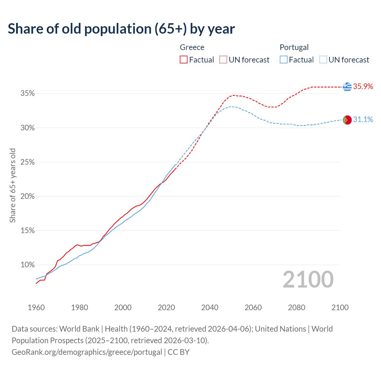 Median age Greece vs Portugal, 1960-2100