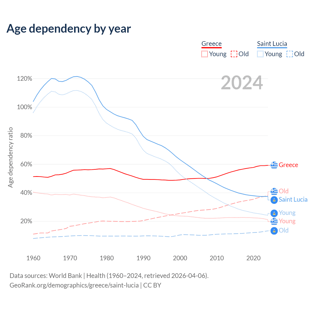 - Greece is ranked 6/196 by median age (oldest to youngest) vs 74/196 for Saint Lucia.