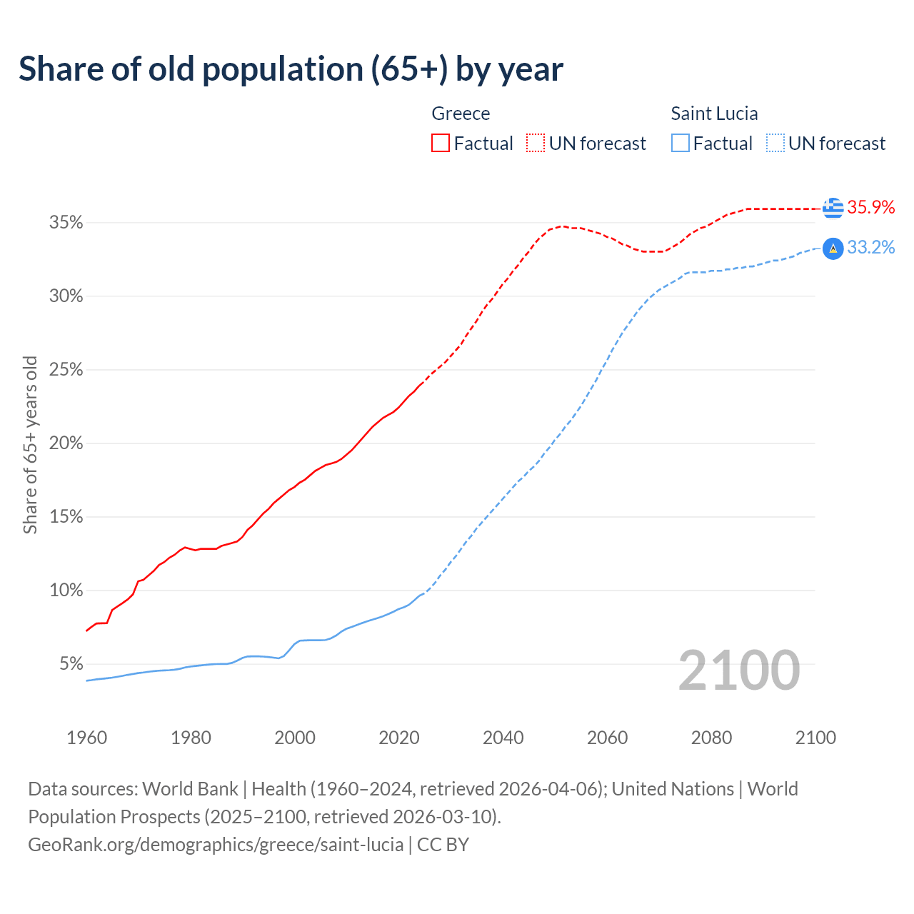 - The share of old-age demographic (65+) in Greece is 23.9% vs 9.62% in Saint Lucia.