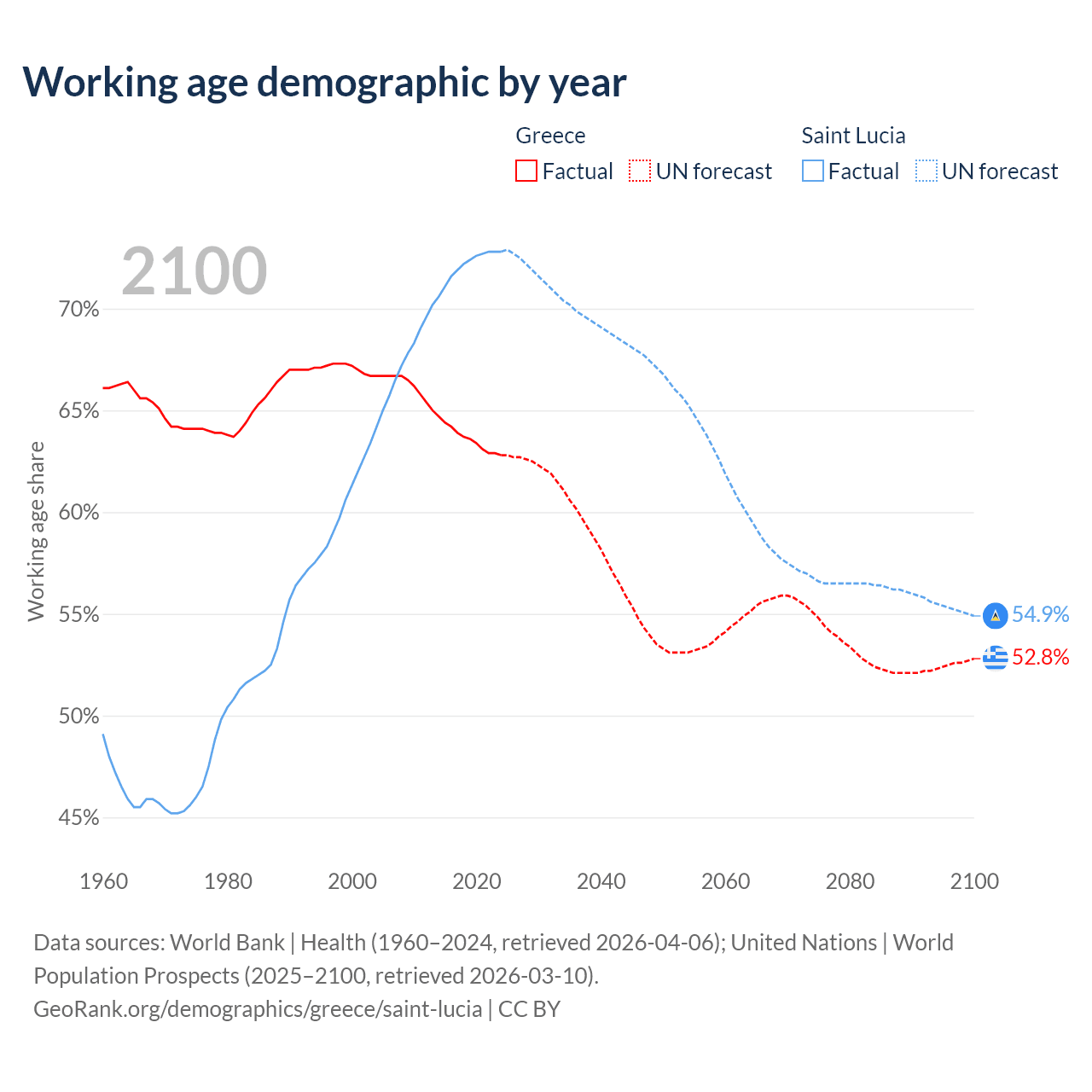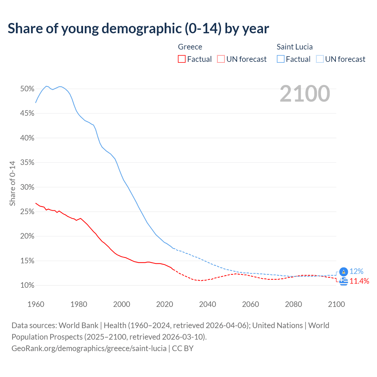 - The share of young demographic (0-15 years old) in Greece is 13.2% vs 17.5% in Saint Lucia.