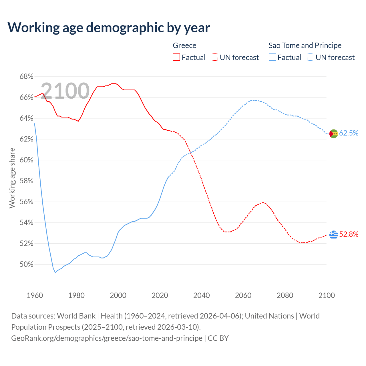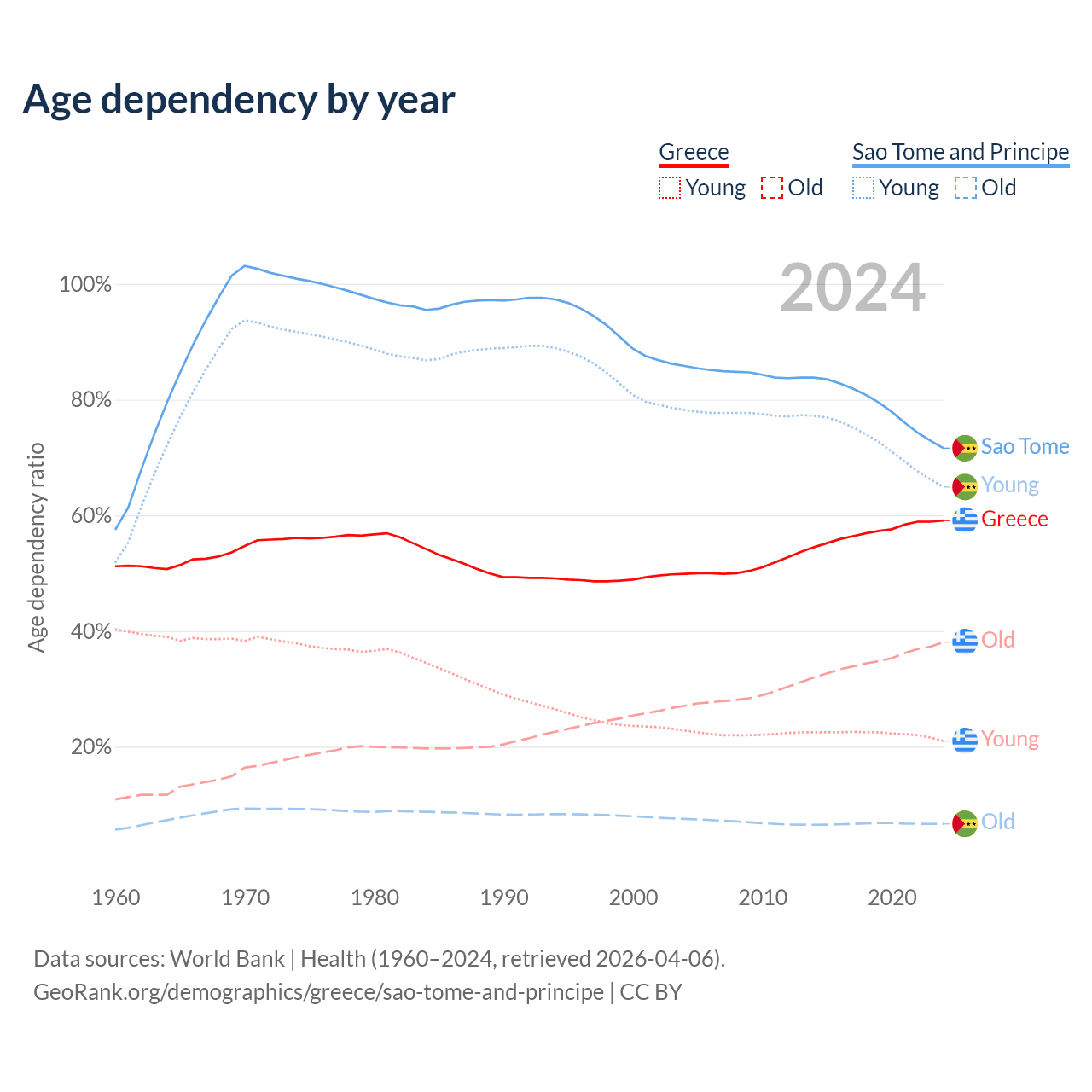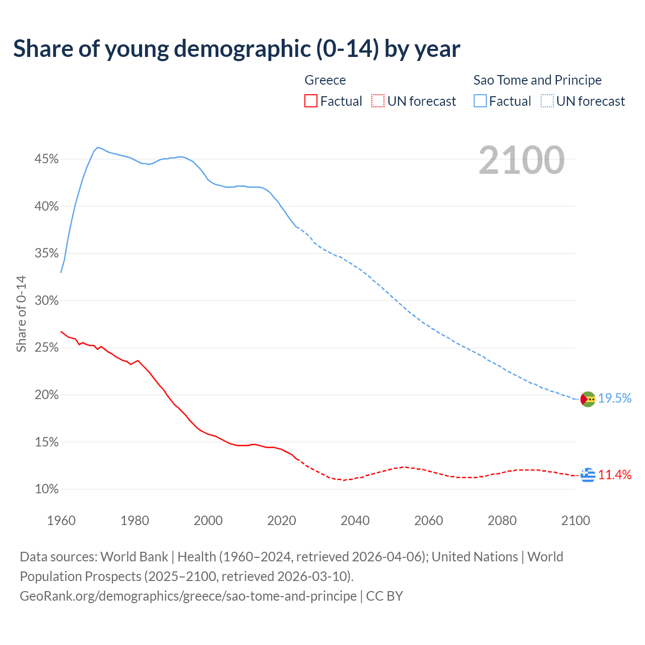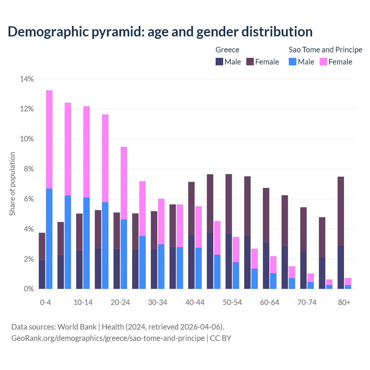 - The share of young demographic (0-15 years old) in Greece is 13.2% vs 37.8% in Sao Tome and Principe.