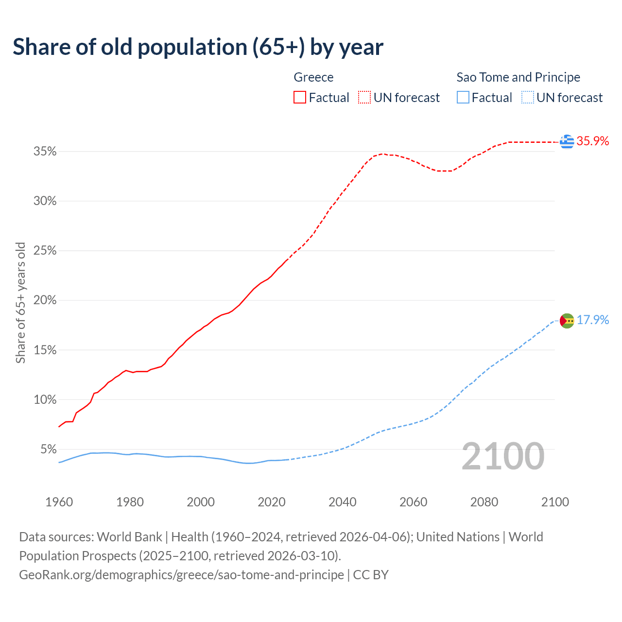 The share of older people aged 65 and over is 23.9% in Greece and 3.9% in Sao Tome and Principe. Life expectancy in Greece compared to Sao Tome and Principe .