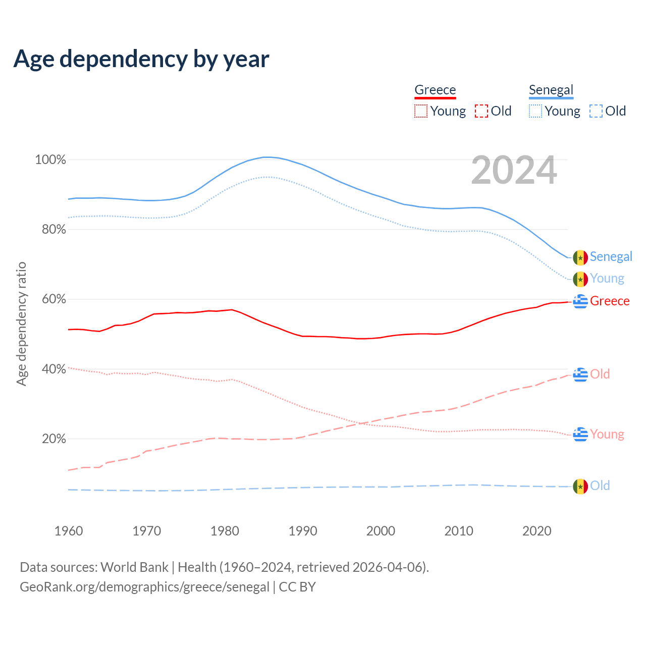 - Greece is ranked 6/196 by median age (oldest to youngest) vs 162/196 for Senegal.