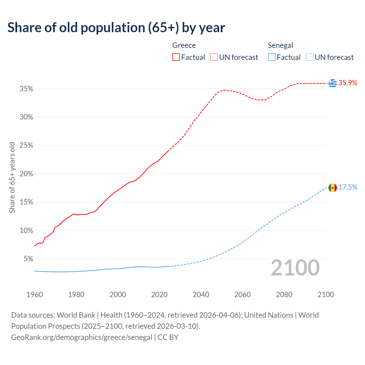 The share of older people aged 65 and over is 23.9% in Greece and 3.62% in Senegal. Life expectancy in Greece compared to Senegal .