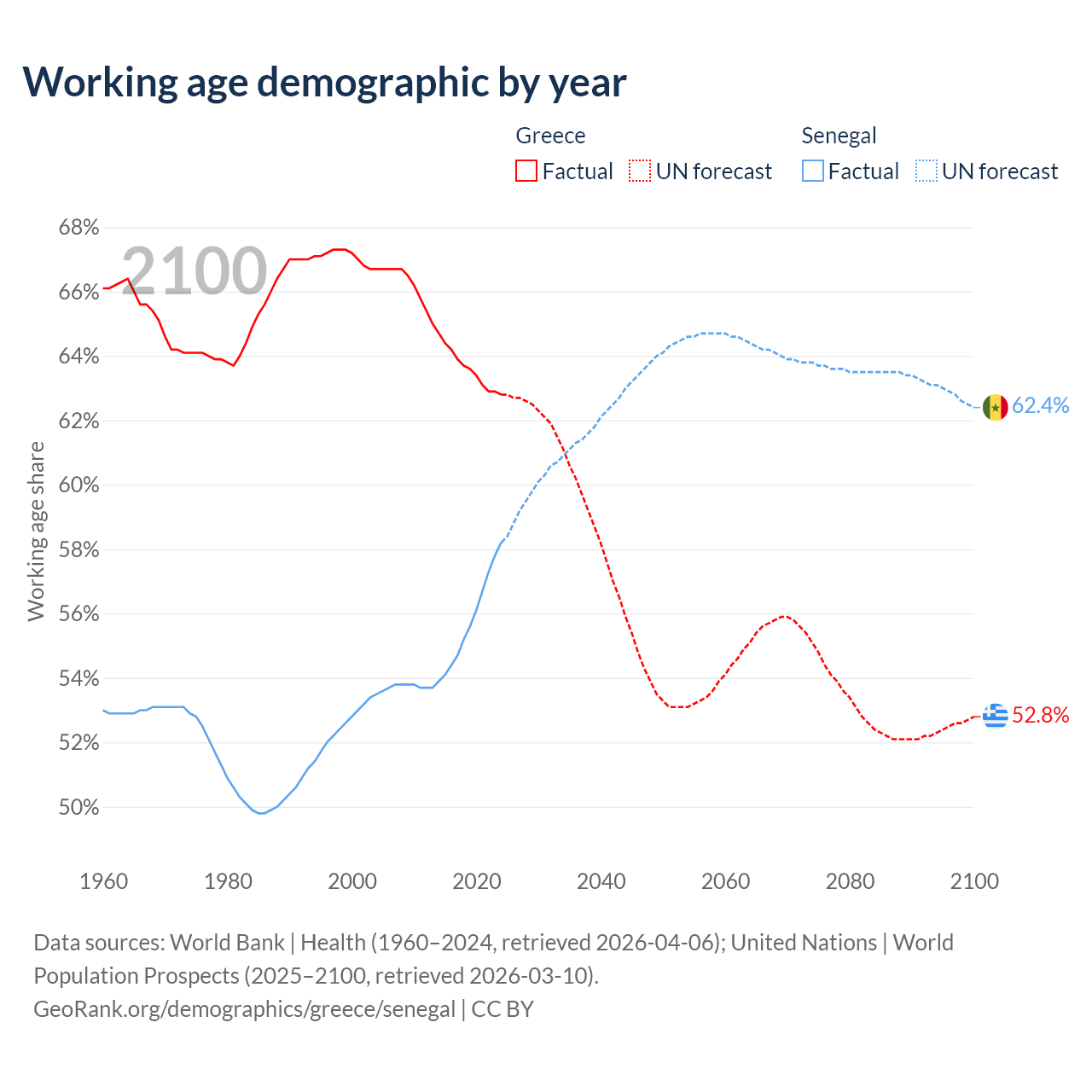 - Greece has 6.4M working age adults (aged 15-64) vs 11.3M in Senegal.