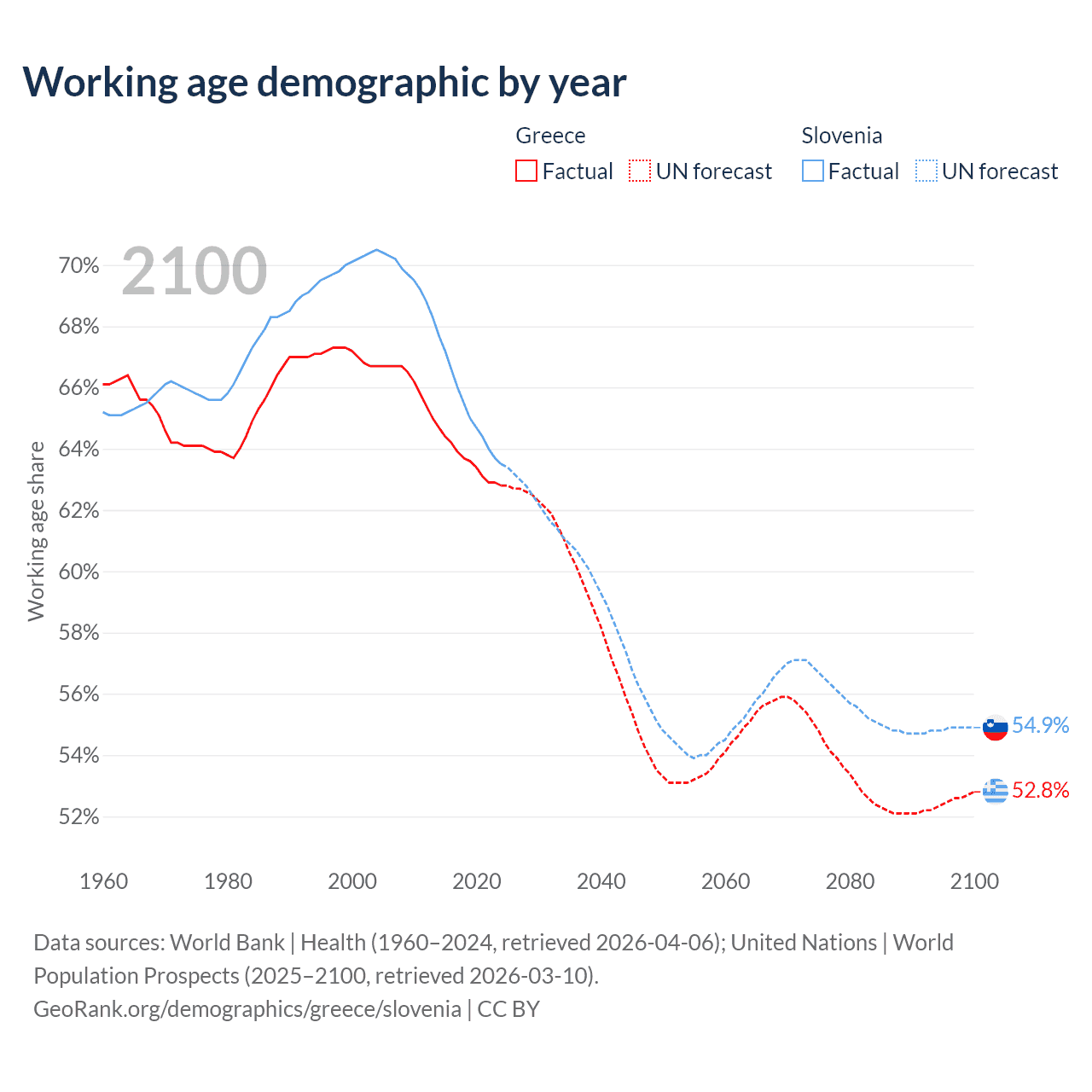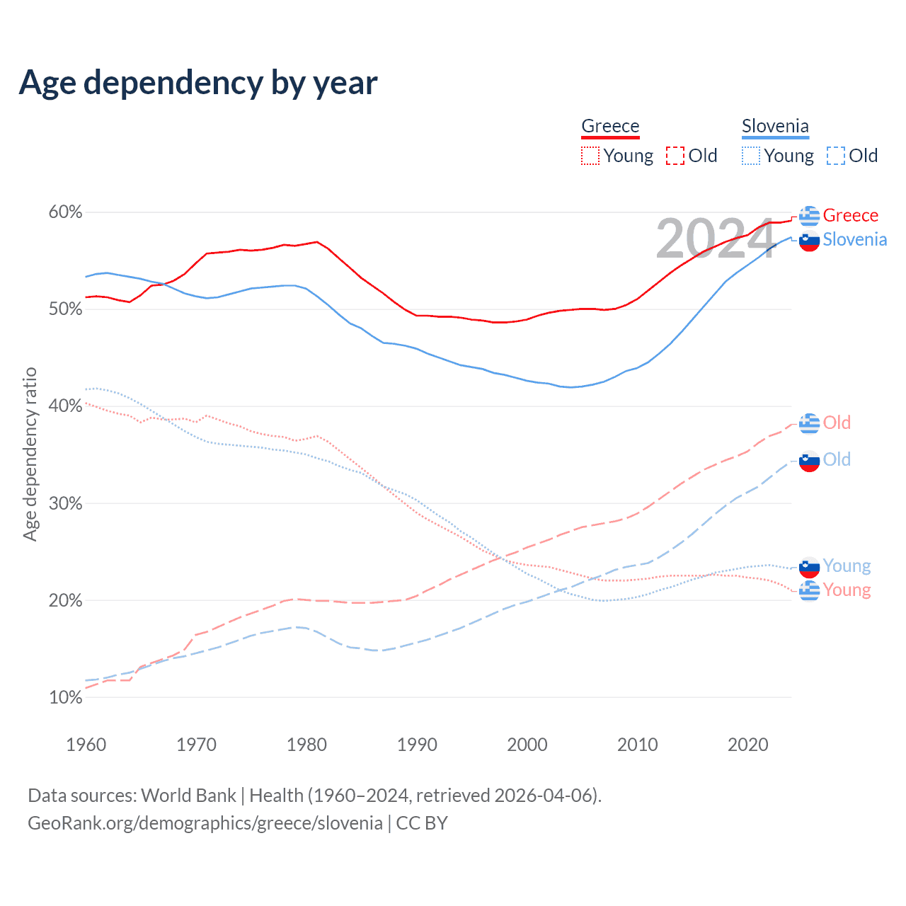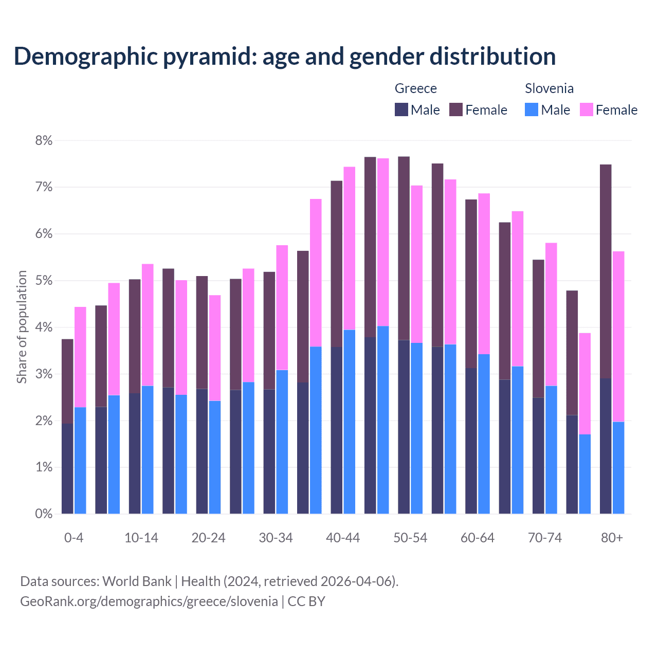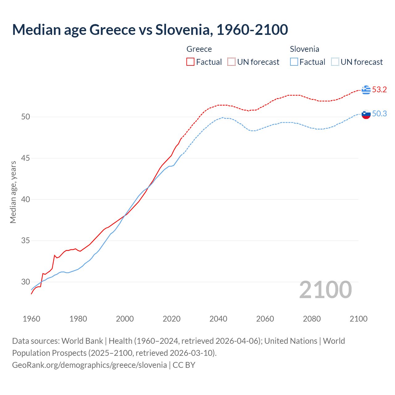 - Greece is ranked 6/196 by median age (oldest to youngest) vs 14/196 for Slovenia.