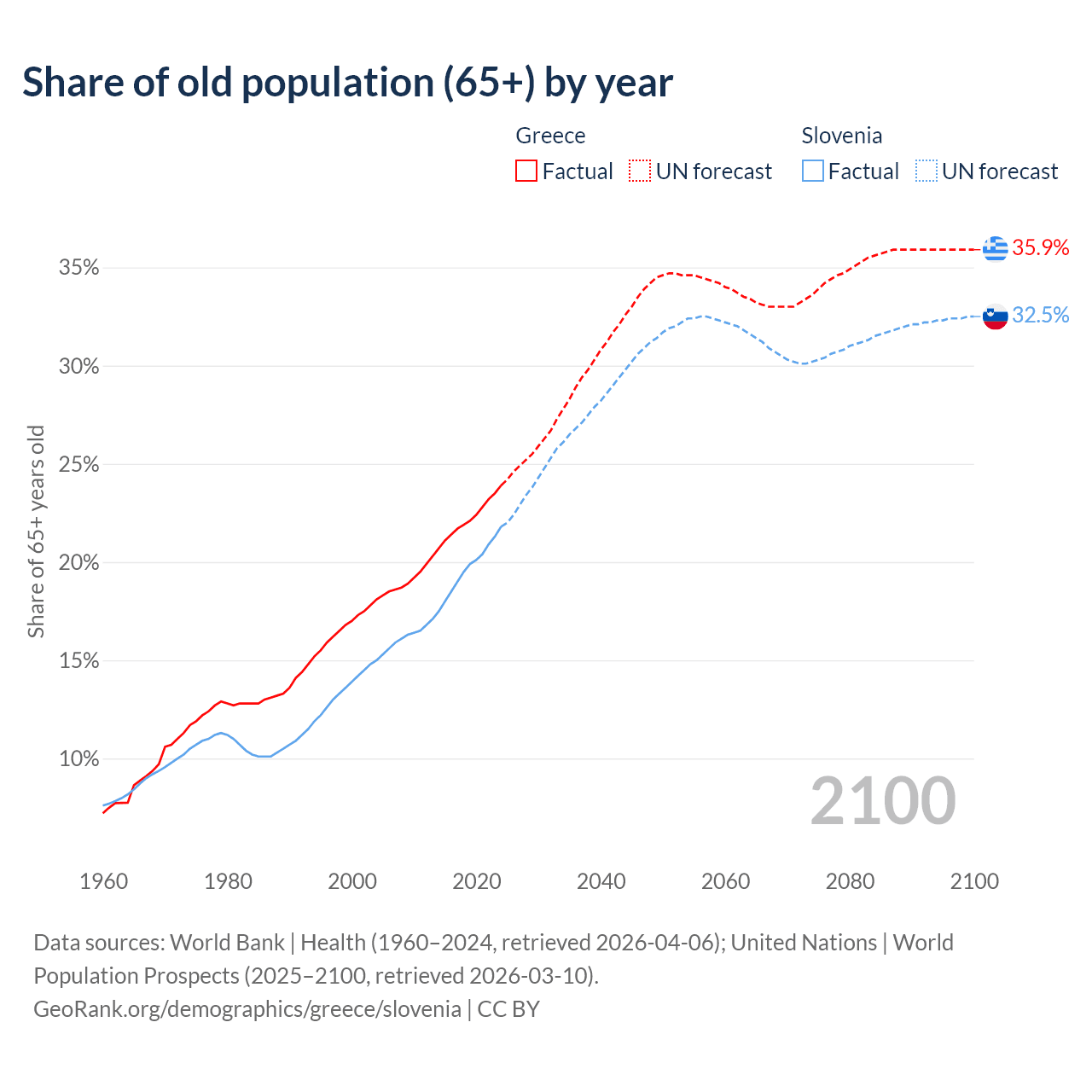 The share of older people aged 65 and over is 23.9% in Greece and 21.8% in Slovenia. Life expectancy in Greece compared to Slovenia .