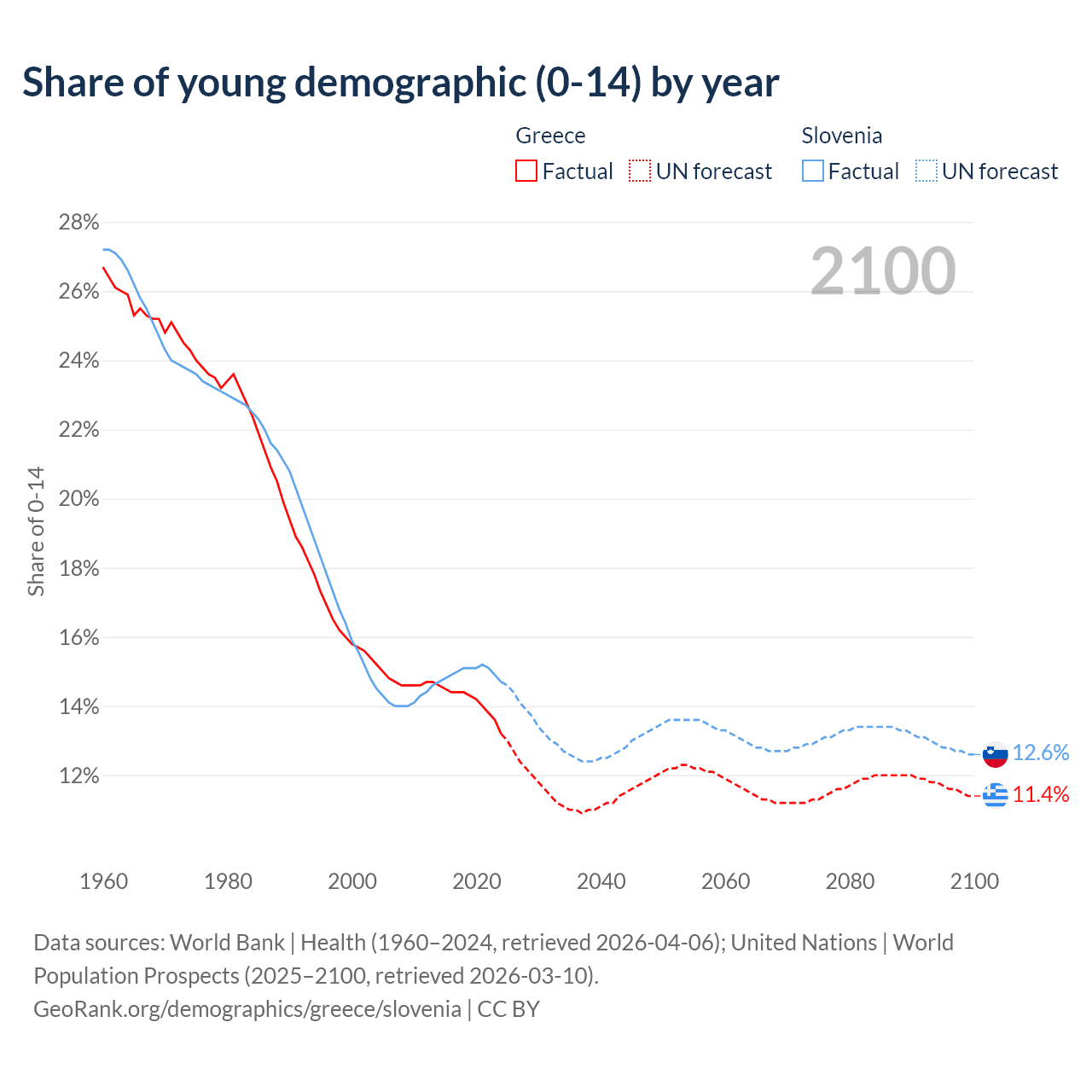 - The share of young demographic (0-15 years old) in Greece is 13.2% vs 14.7% in Slovenia.