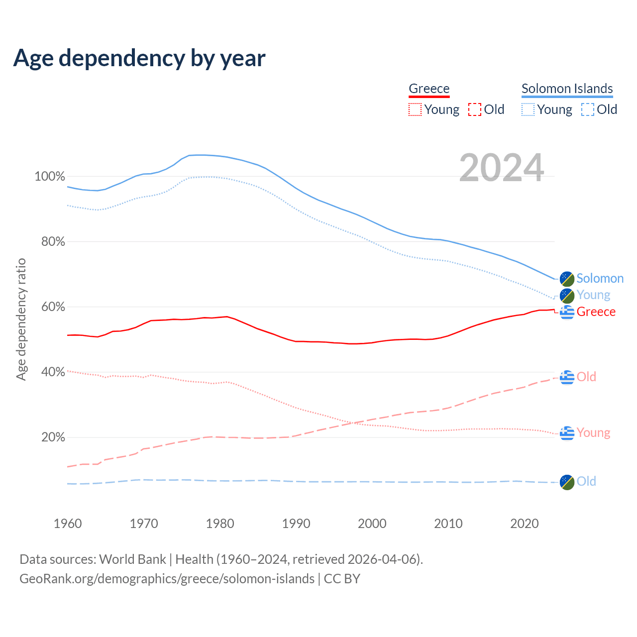 - The share of old-age demographic (65+) in Greece is 23.9% vs 3.64% in the Solomon Islands.