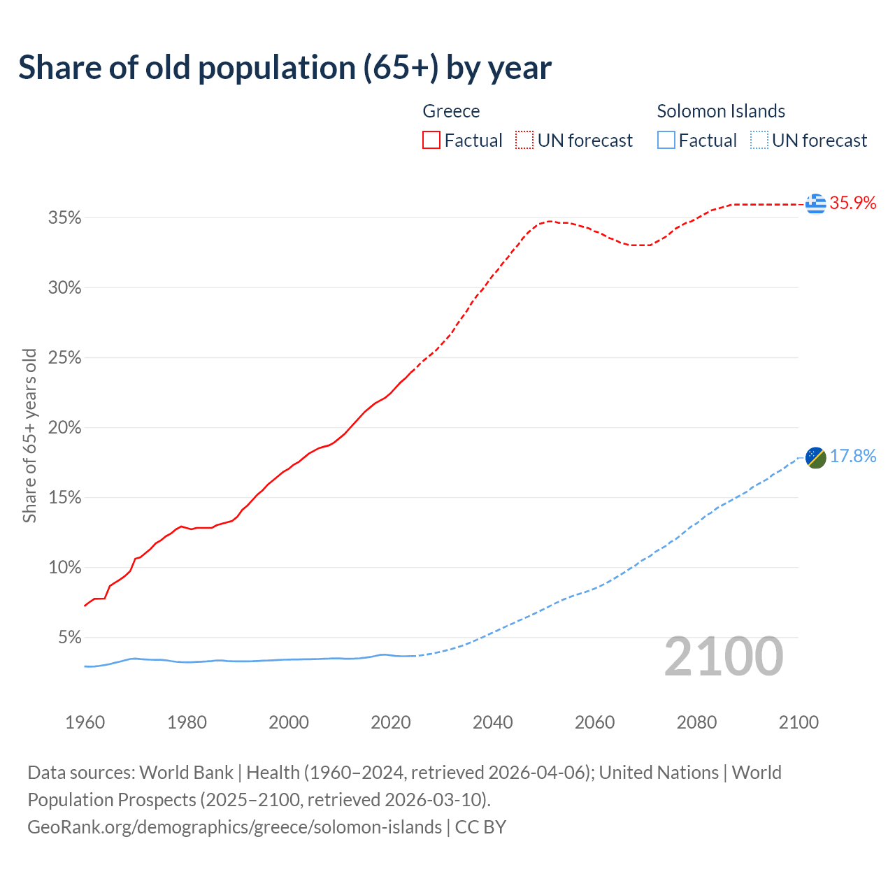 The share of older people aged 65 and over is 23.9% in Greece and 3.64% in the Solomon Islands. Life expectancy in Greece compared to the Solomon Islands .