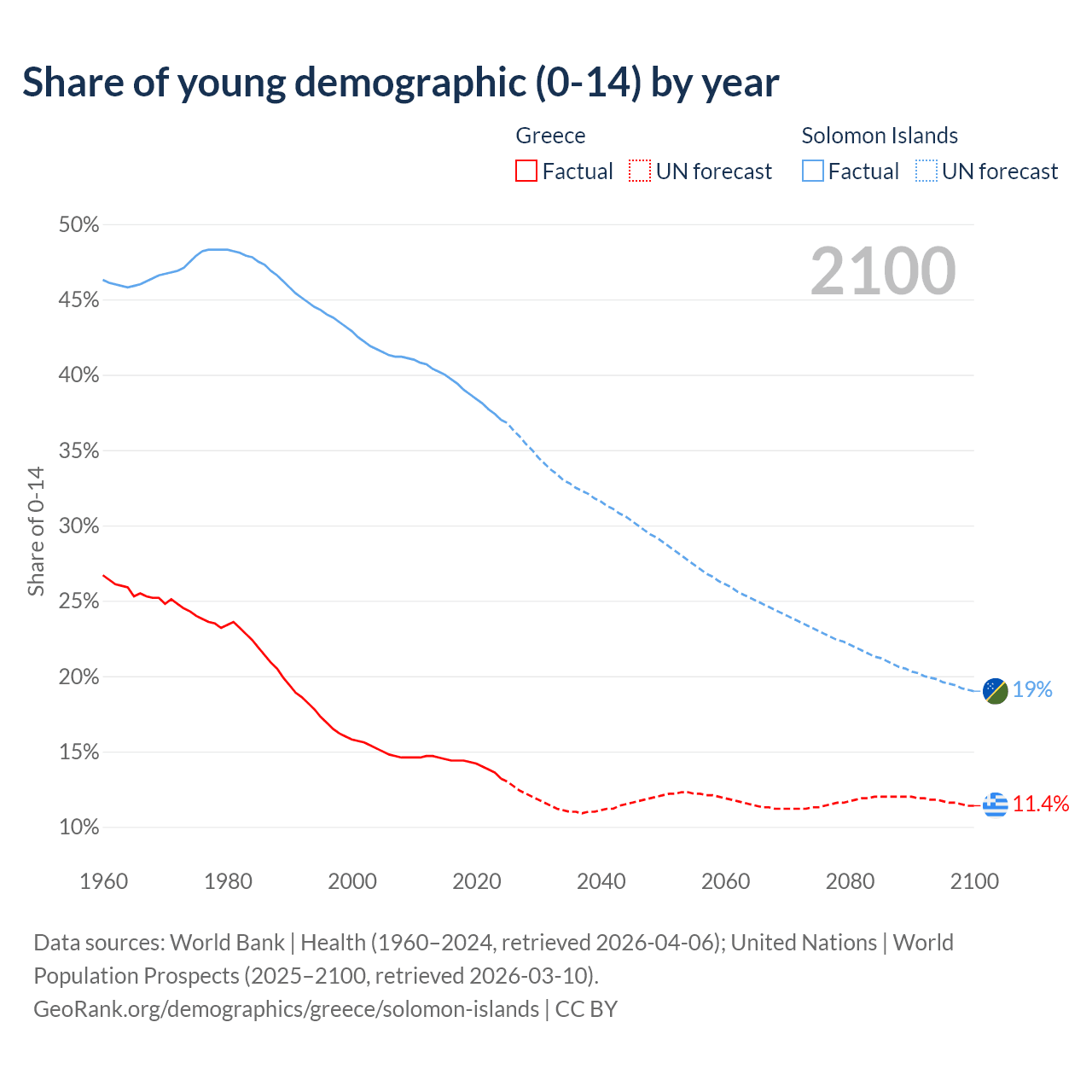 - The share of young demographic (0-15 years old) in Greece is 13.2% vs 37% in the Solomon Islands.