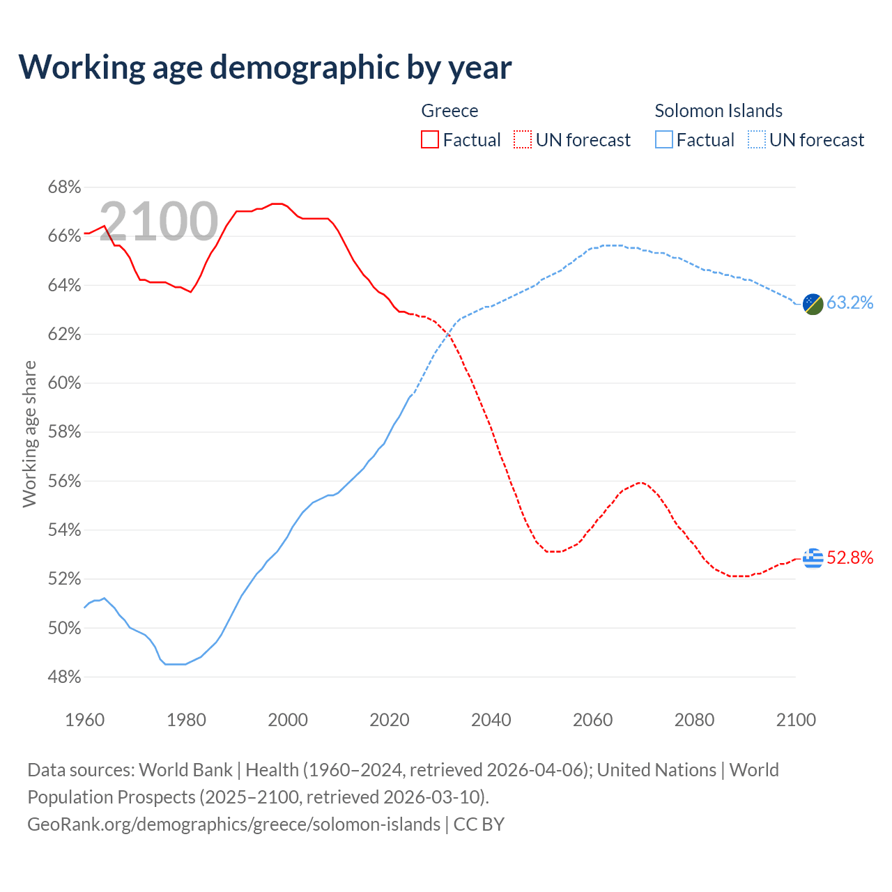 Median age Greece vs Solomon Islands, 1960-2100