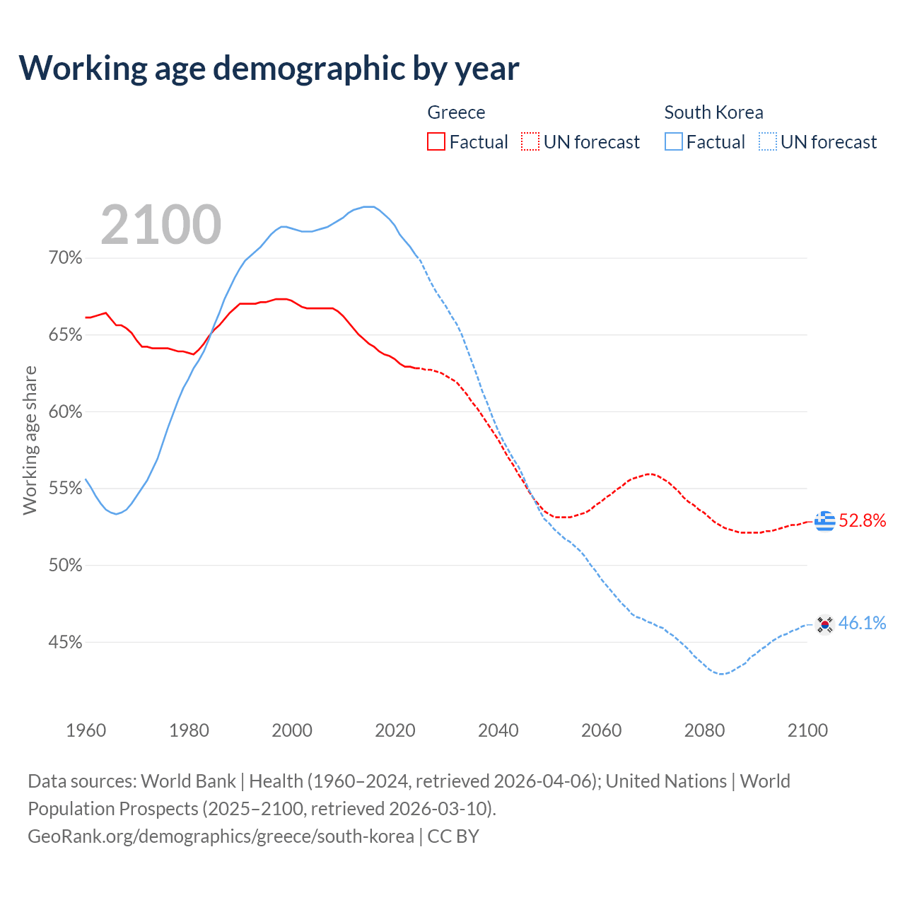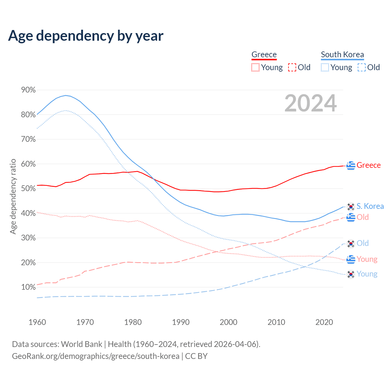 - Greece is ranked 6/196 by median age (oldest to youngest) vs 10/196 for South Korea.