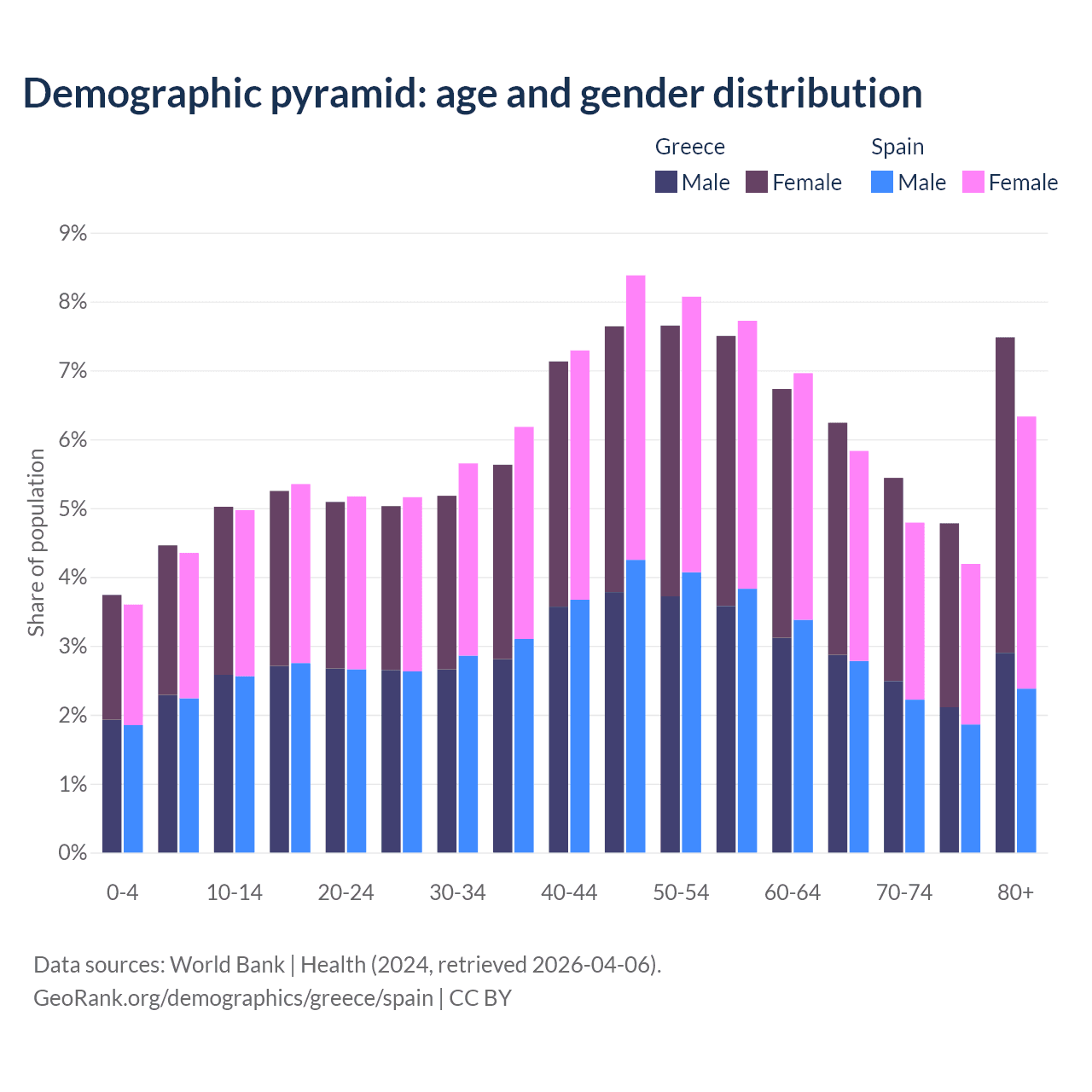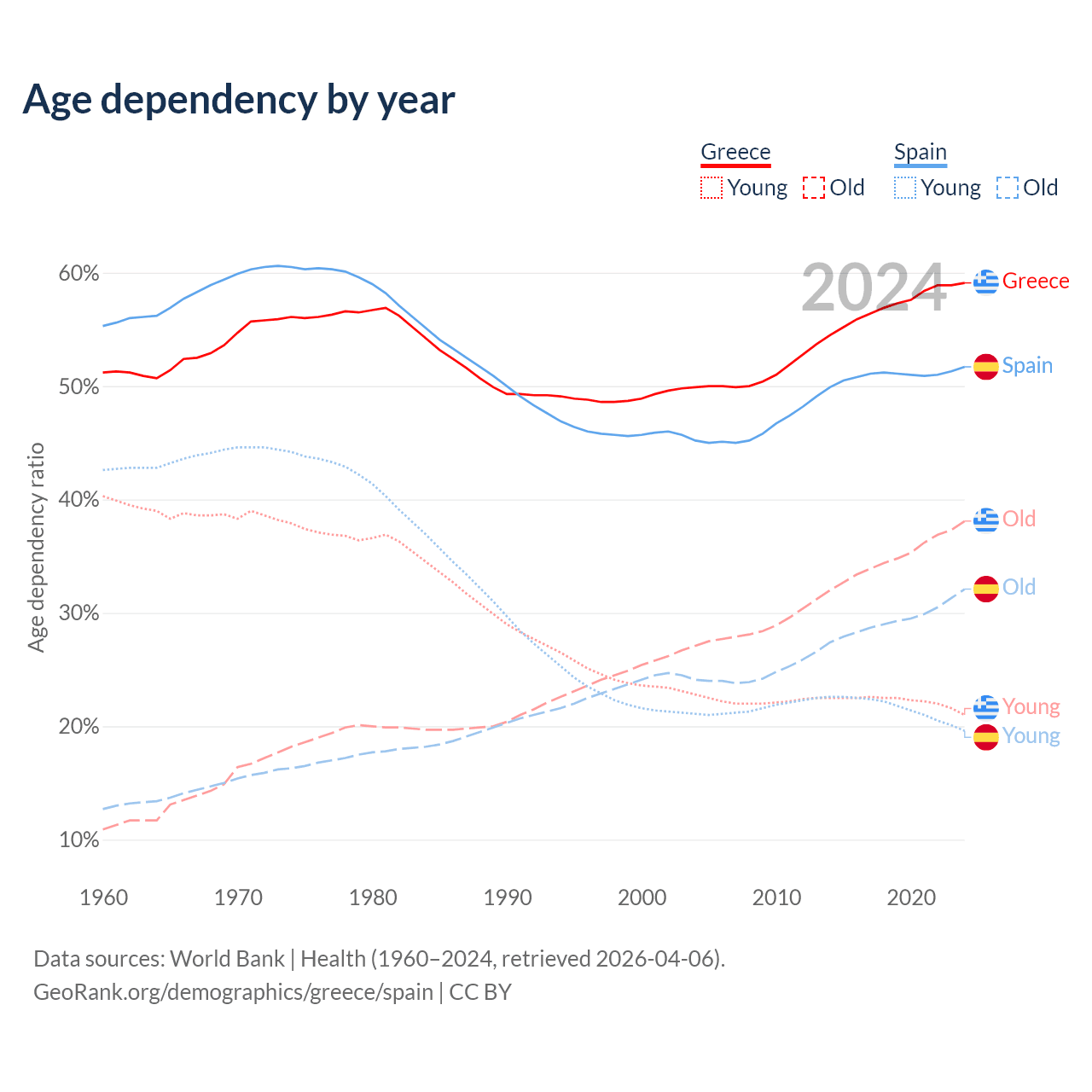 - Greece is ranked 6/196 by median age (oldest to youngest) vs 7/196 for Spain.