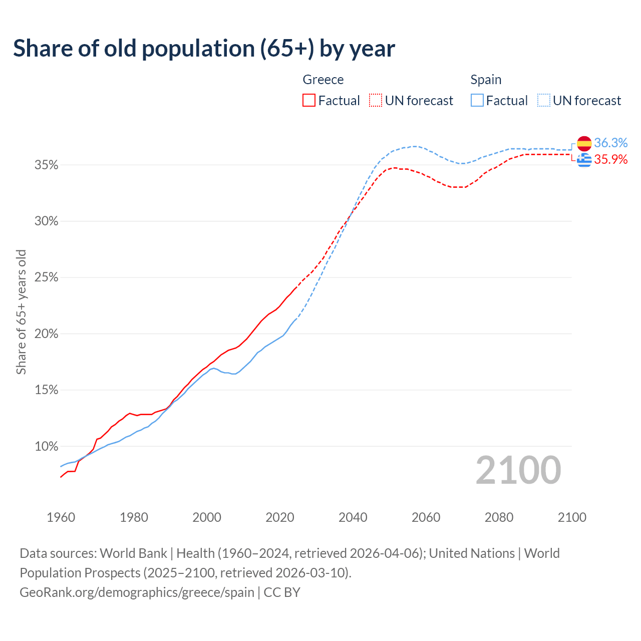The share of older people aged 65 and over is 23.9% in Greece and 21.1% in Spain. Life expectancy in Greece compared to Spain .