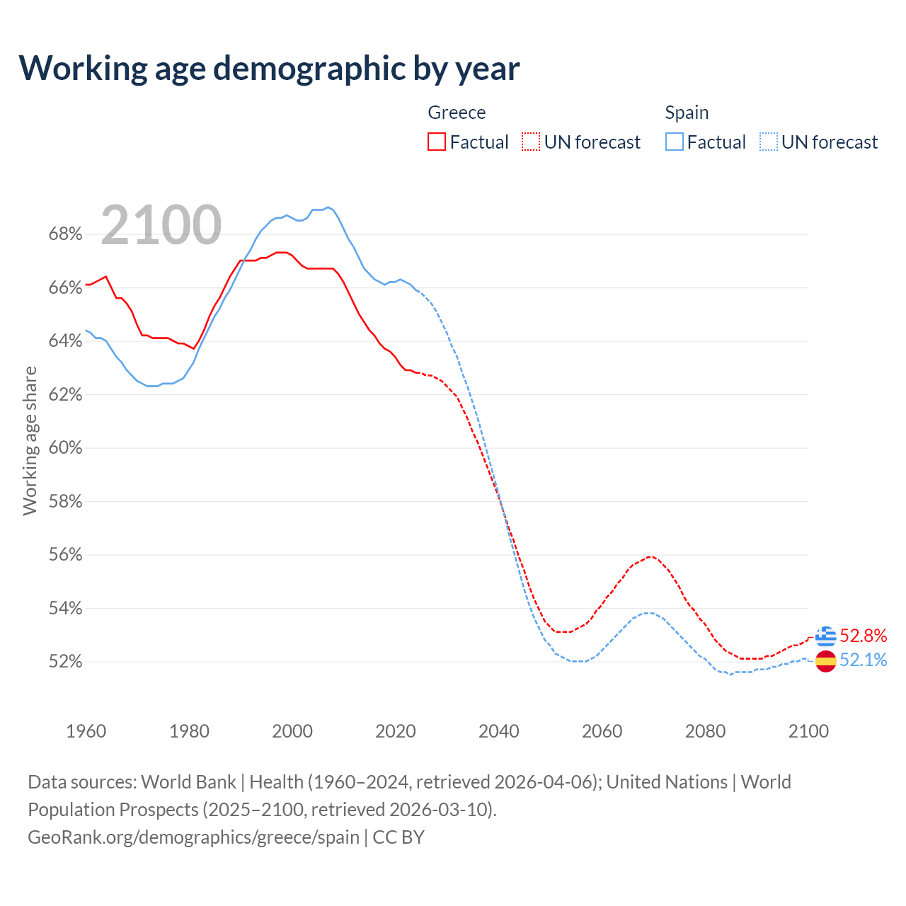 Median age Greece vs Spain, 1960-2100