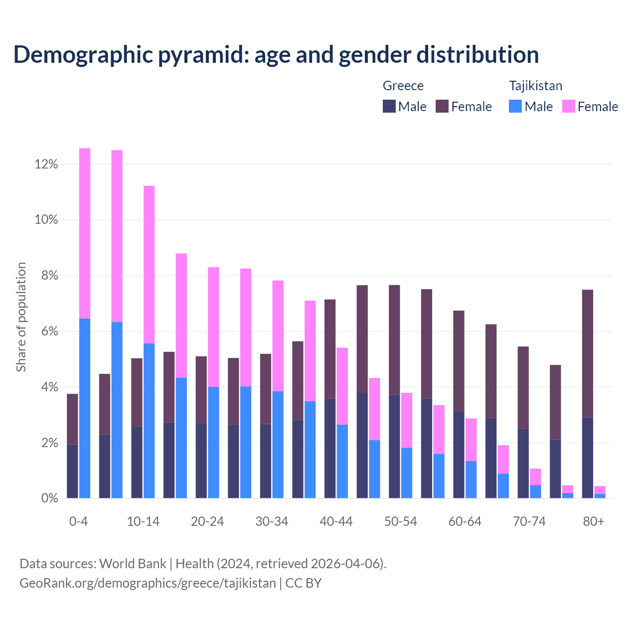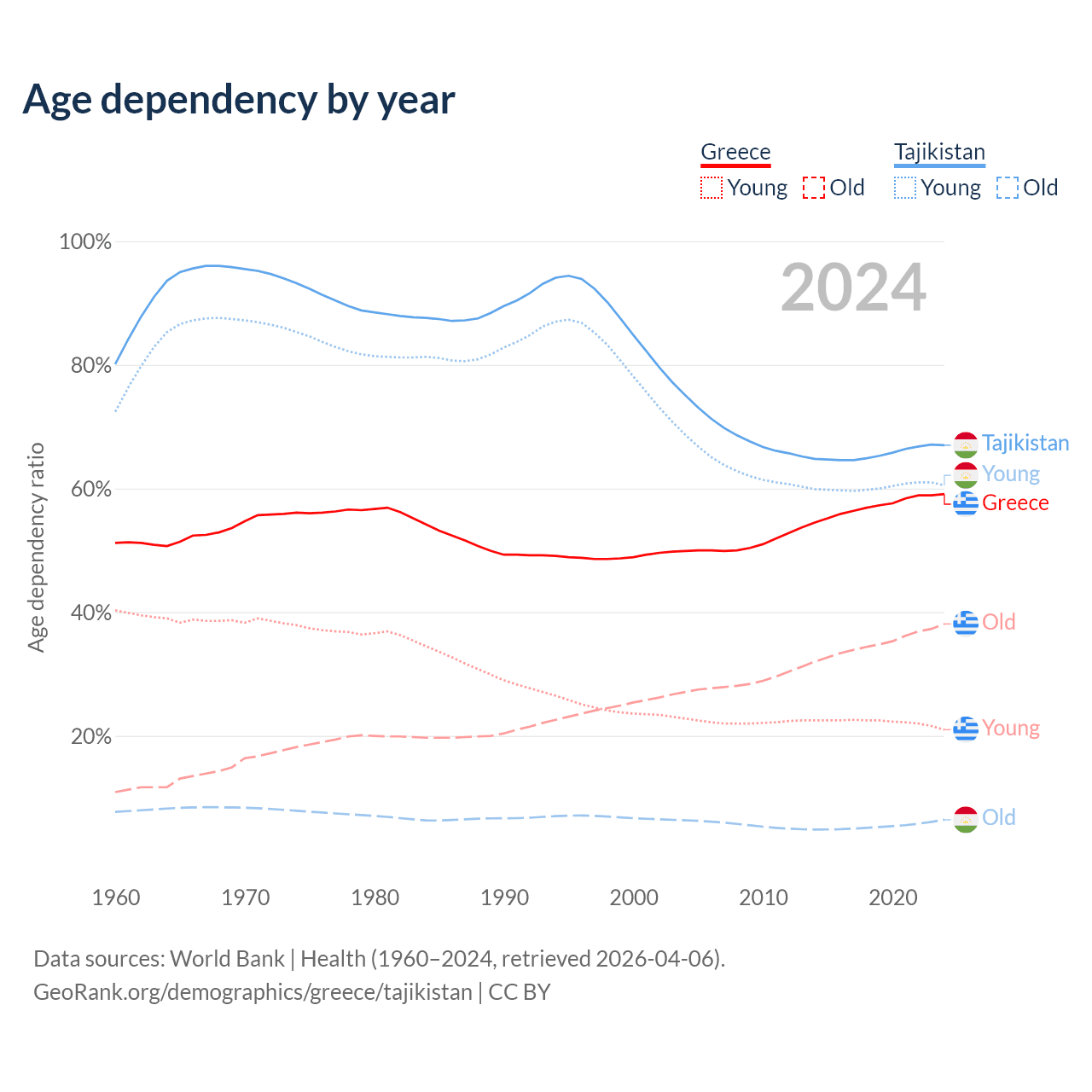 - The share of old-age demographic (65+) in Greece is 23.9% vs 3.85% in Tajikistan.