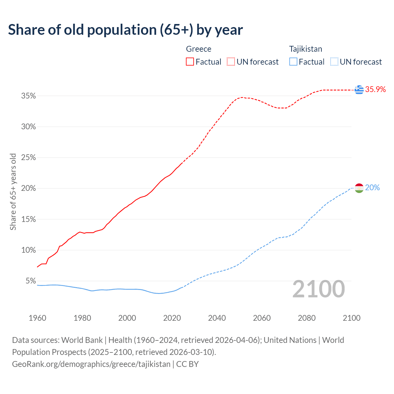 The share of older people aged 65 and over is 23.9% in Greece and 3.85% in Tajikistan. Life expectancy in Greece compared to Tajikistan .