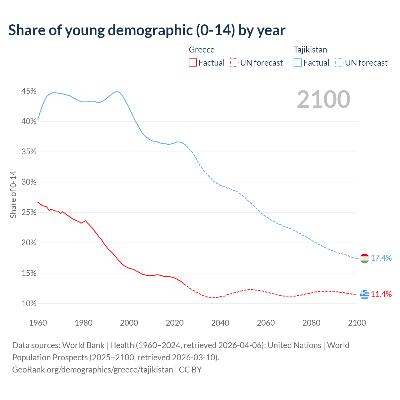 - The share of young demographic (0-15 years old) in Greece is 13.2% vs 36.3% in Tajikistan.