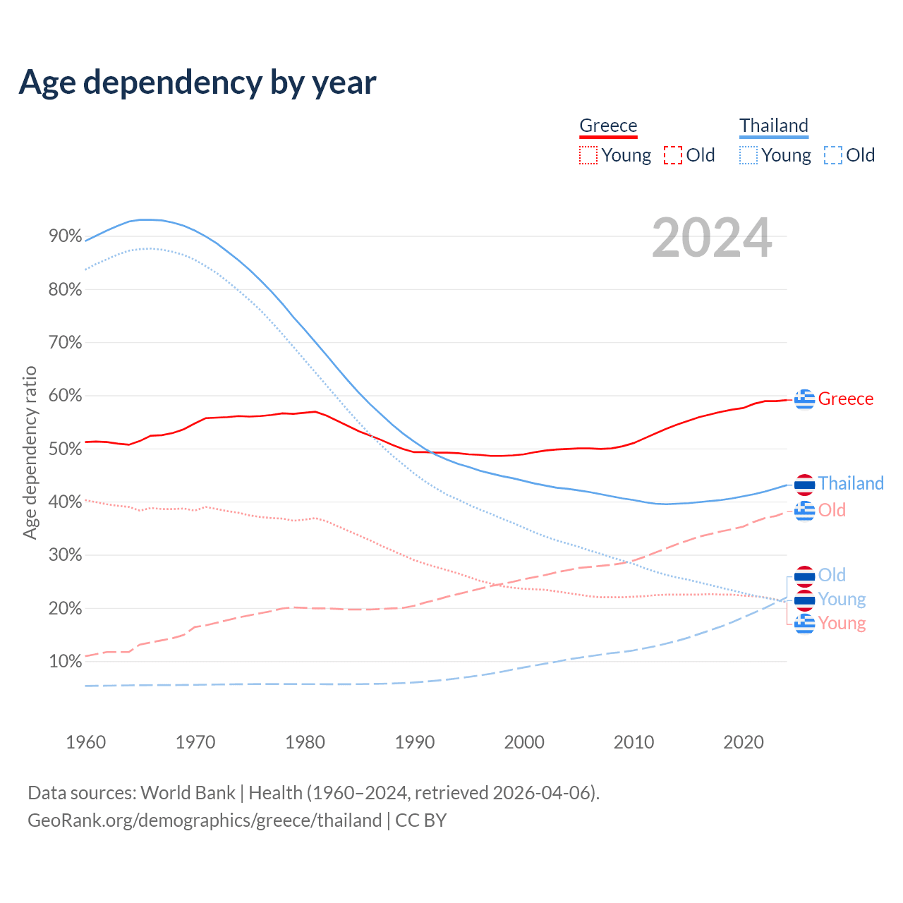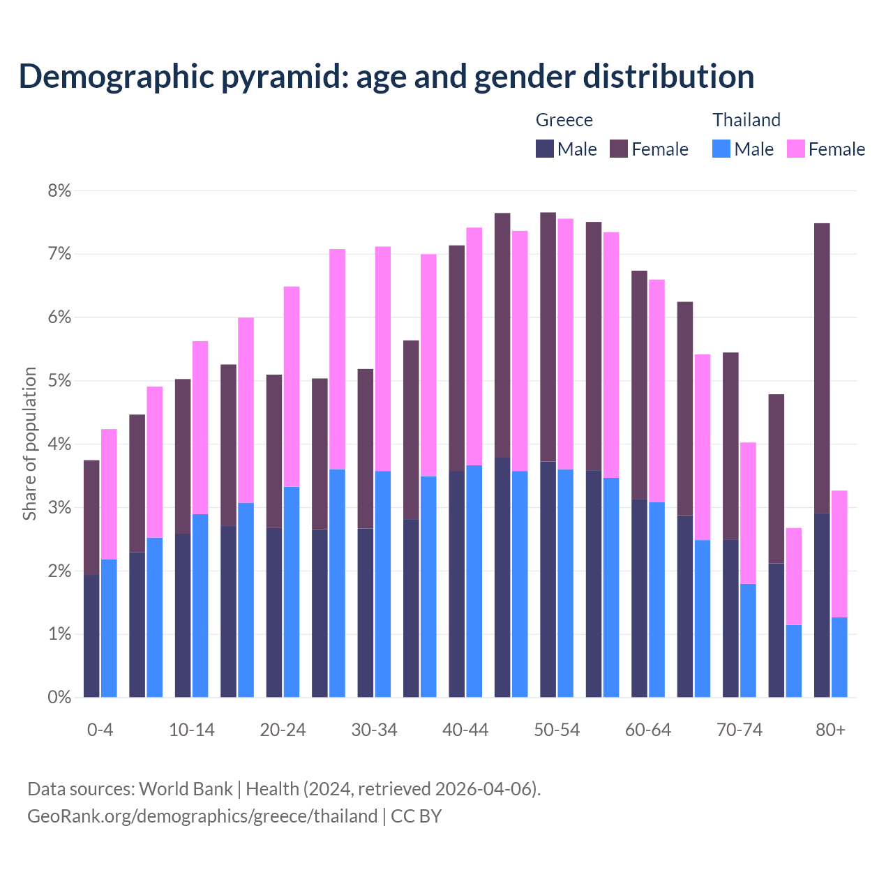 - Greece is ranked 6/196 by median age (oldest to youngest) vs 40/196 for Thailand.