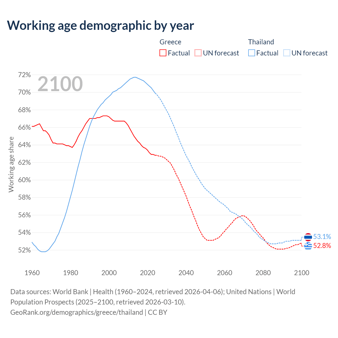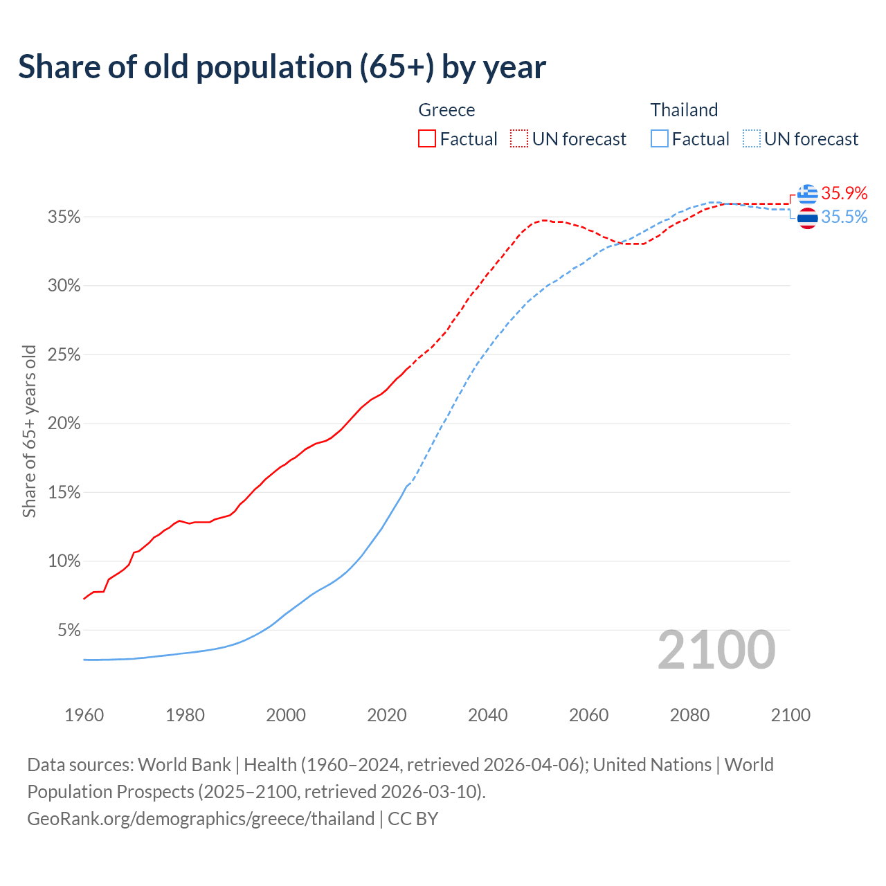 Median age Greece vs Thailand, 1960-2100