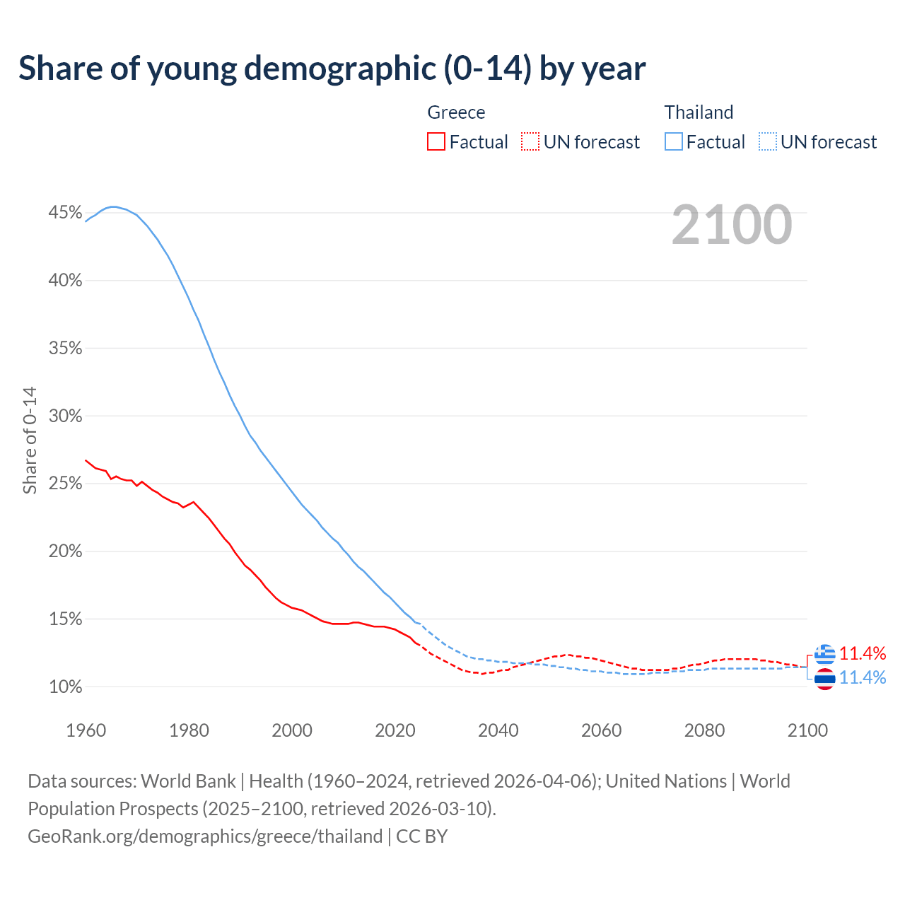 - The share of young demographic (0-15 years old) in Greece is 13.2% vs 14.7% in Thailand.