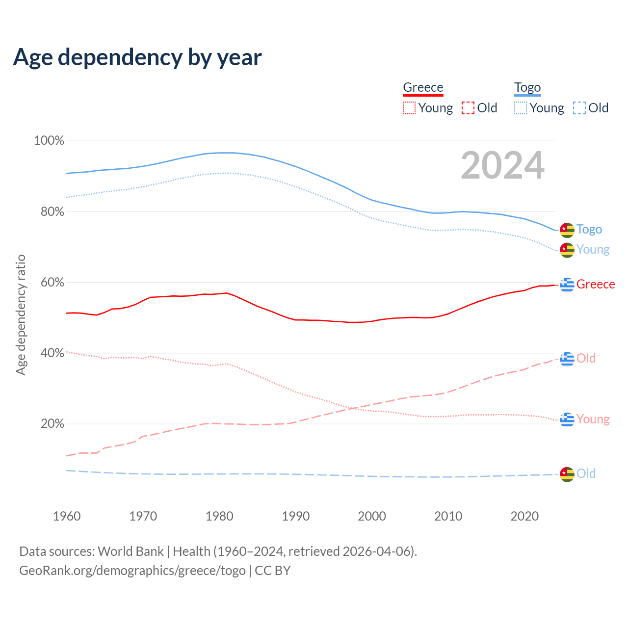 The share of older people aged 65 and over is 23.9% in Greece and 3.21% in Togo. Life expectancy in Greece compared to Togo .