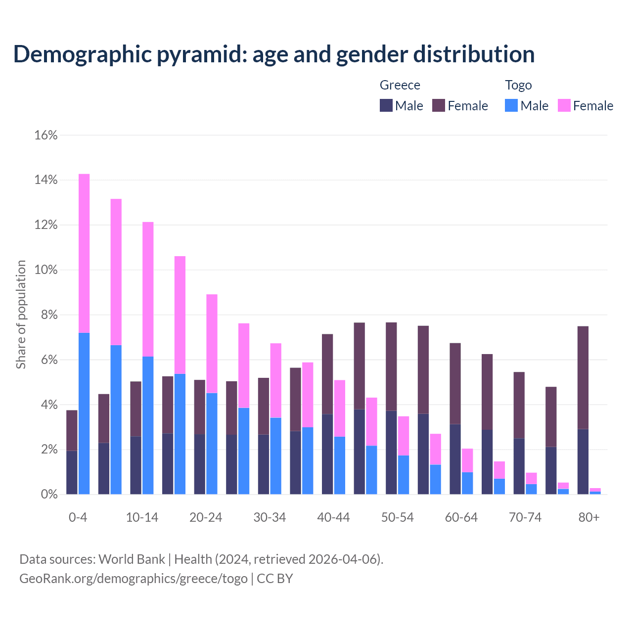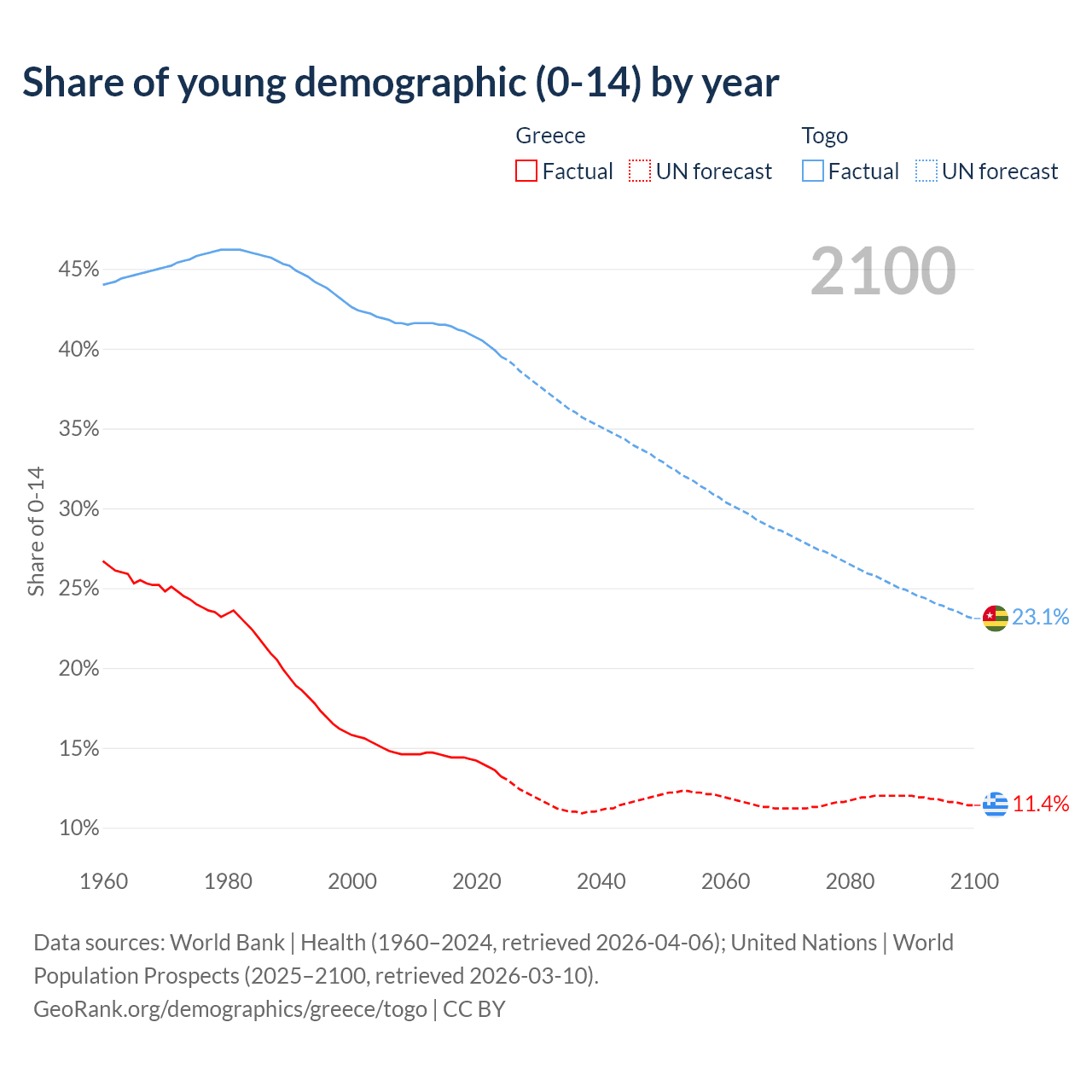 - The share of young demographic (0-15 years old) in Greece is 13.2% vs 39.5% in Togo.