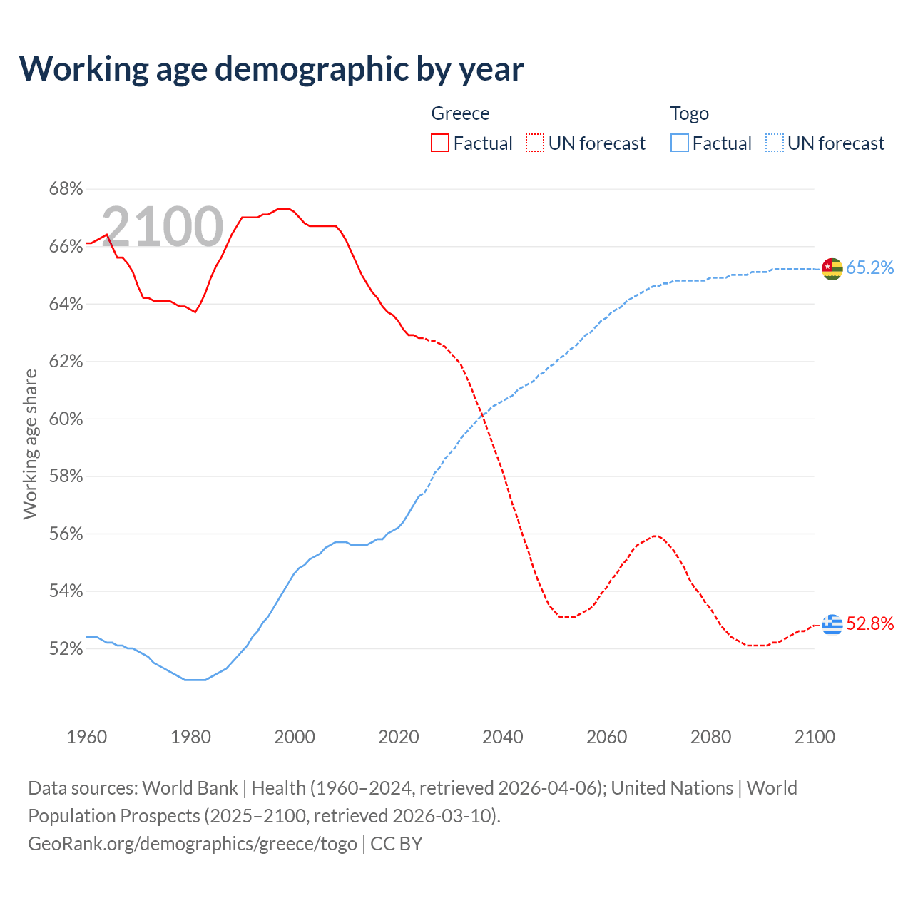 - Greece has 6.4M working age adults (aged 15-64) vs 5.72M in Togo.