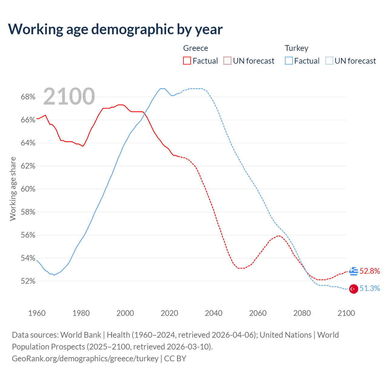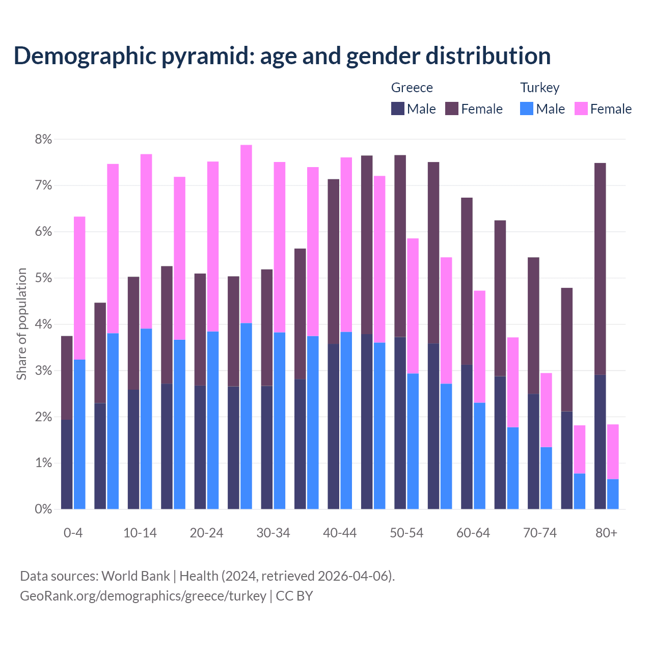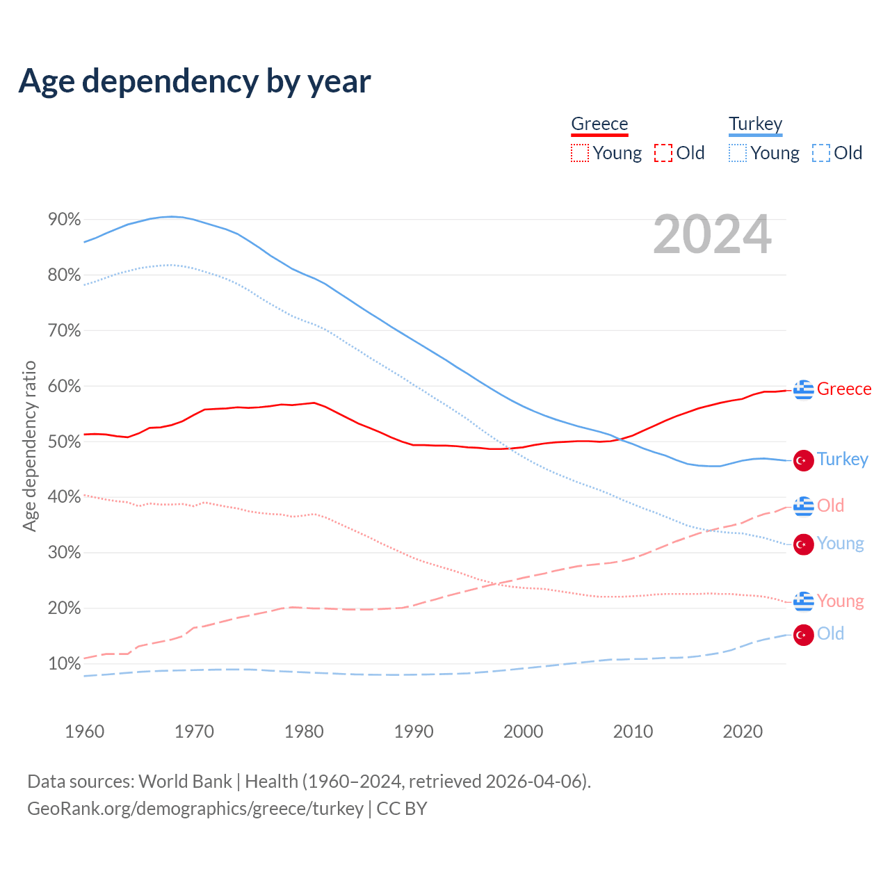 - Greece is ranked 6/196 by median age (oldest to youngest) vs 83/196 for Turkey.