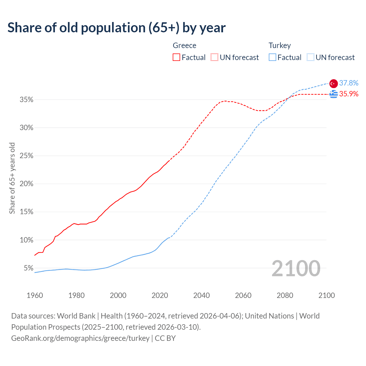 The share of older people aged 65 and over is 23.9% in Greece and 10.3% in Turkey. Life expectancy in Greece compared to Turkey .