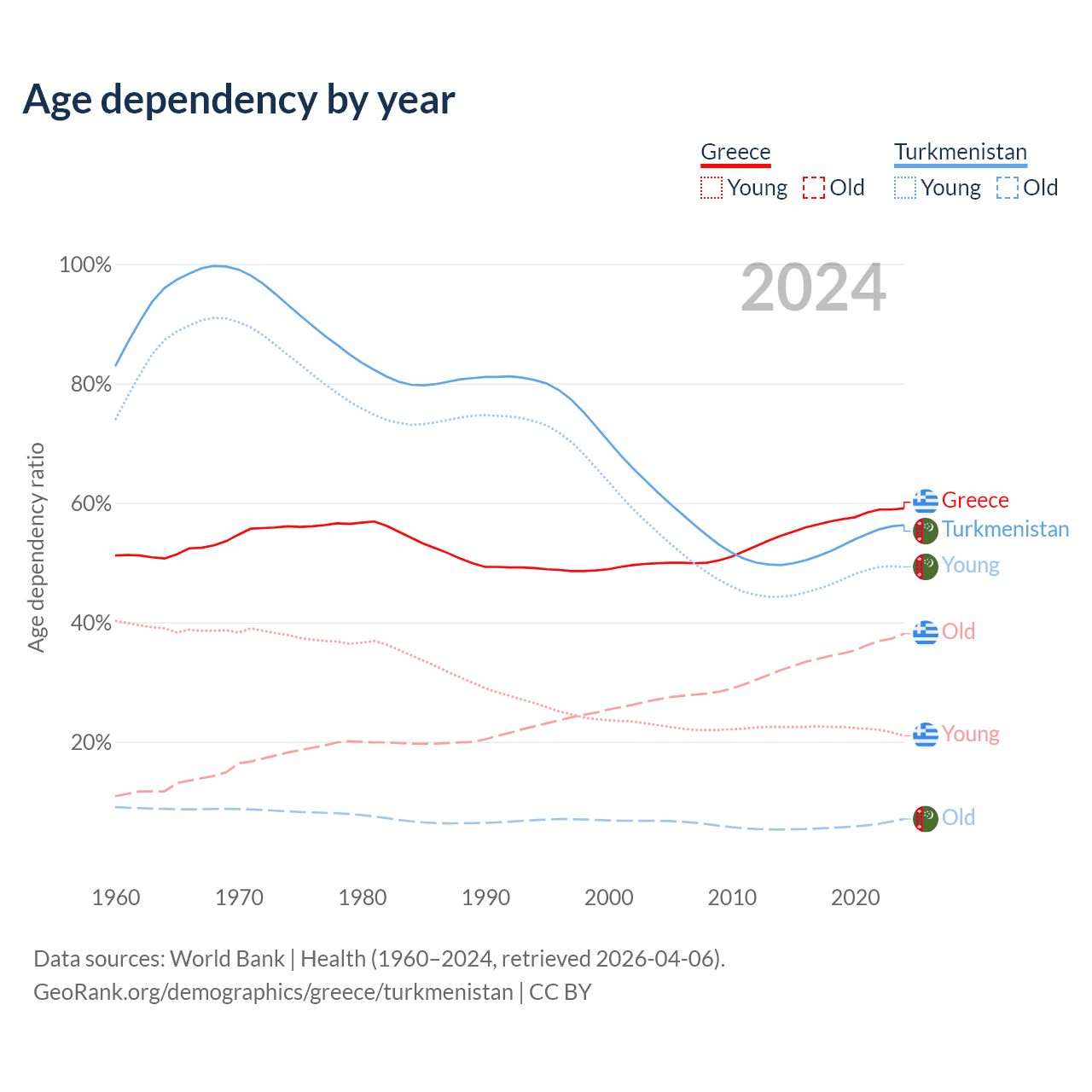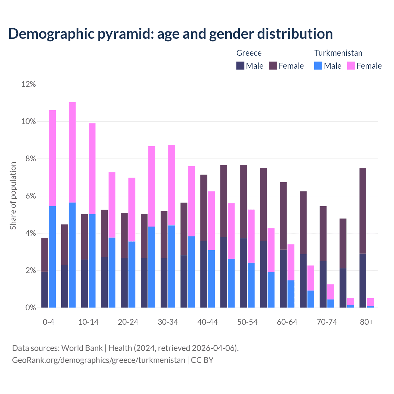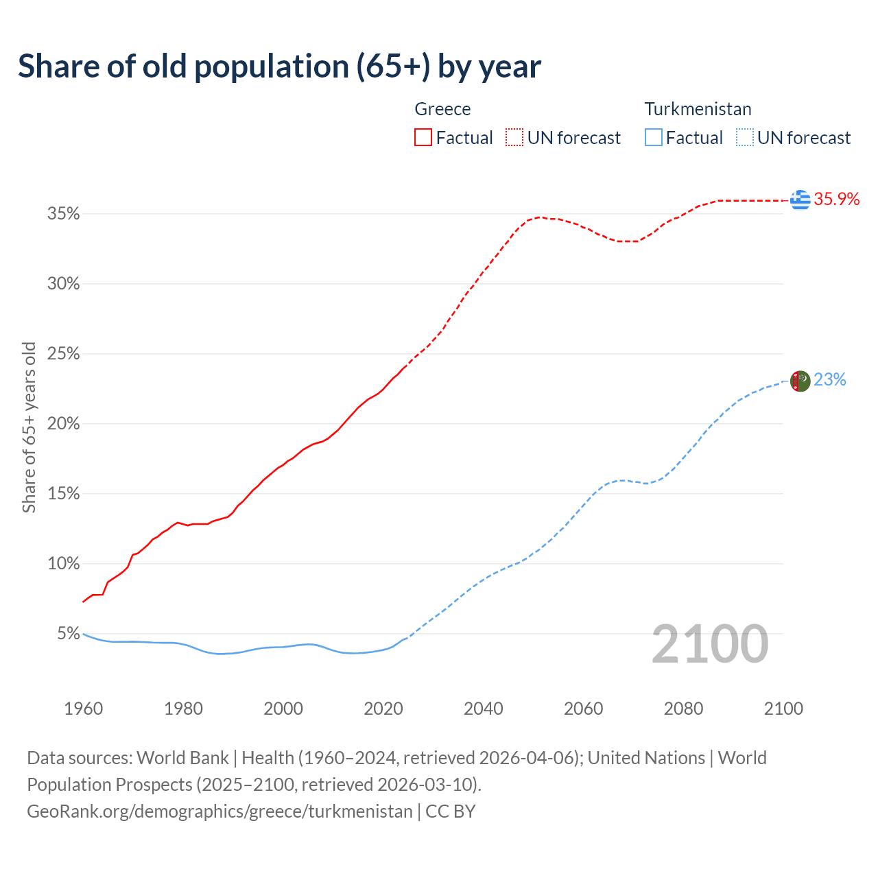 The share of older people aged 65 and over is 23.9% in Greece and 4.53% in Turkmenistan. Life expectancy in Greece compared to Turkmenistan .