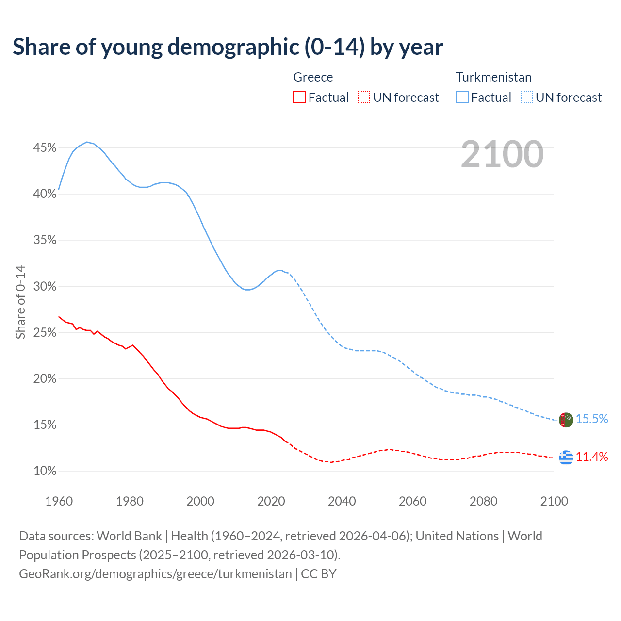 - The share of young demographic (0-15 years old) in Greece is 13.2% vs 31.5% in Turkmenistan.